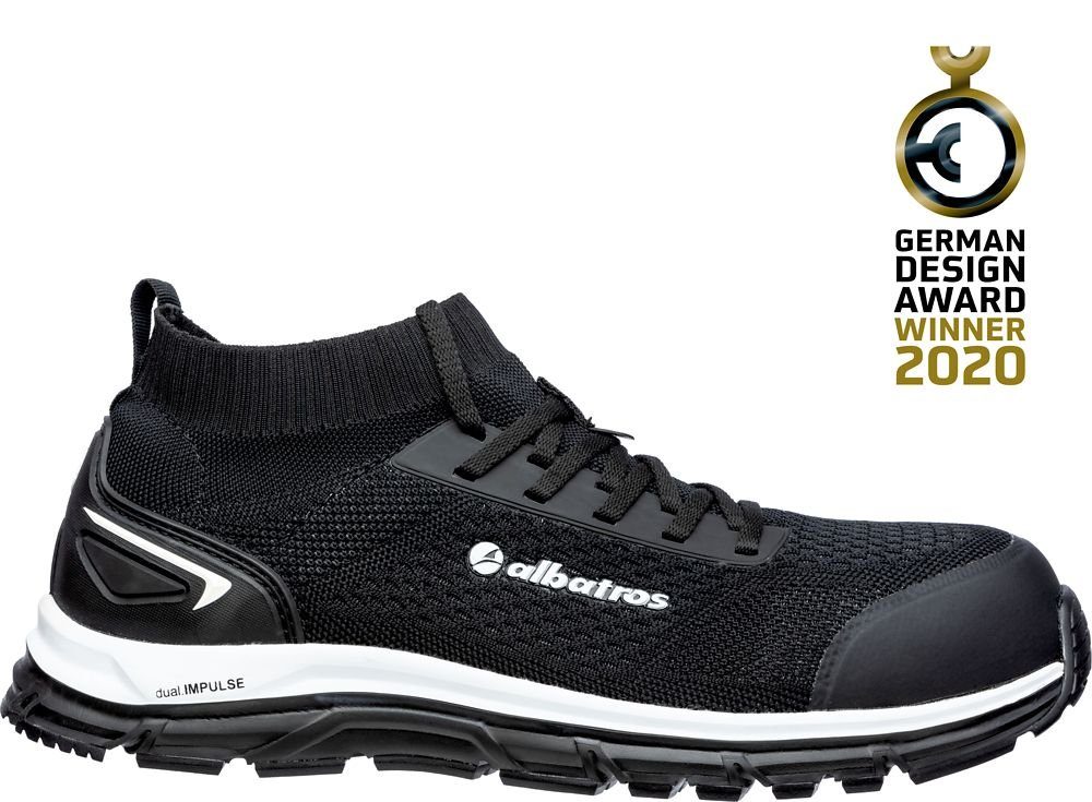 Der Albatros ULTIMATE IMPULSE BLACK LOW Sicherheitsschuh für Herren punktet nicht nur mit außergewöhnlicher Funktionalität, sondern auch mit seinem jungen/modernen Design und einzigartigem Tragekomfort. Durch sein effektvolles Obermaterial in schwarzer Strick-Optik und dem flexiblen ELASTIC FIT Kragen sieht er nicht nur sportlich aus, er passt sich auch perfekt dem Fuß an und sorgt für ultimative Bewegungsfreiheit. Der sockenähnliche Sitz am Bein schützt Dich optimal vor eindringendem Staub, Schmutz oder Kleinteilen. Eine Anziehschlaufe an der Ferse erleichtert Dir den Einstieg. Die spezielle Sohlenkonstruktion mit der dual.IMPULSE Zwischensohle ist hitzebeständig bis zu 300° Grad und bietet eine optimale Dämpfung und Energierückgabe – den ganzen Tag! Die anatomisch geformte comfit® AIR Einlegesohle passt sich aufgrund ihrer Wabenstruktur perfekt Deinem Fuß an und ist aufgrund zahlreicher Poren atmungsaktiv und verhindert Schweißfüße. Deine Muskulatur wird beim Gehen zusätzlich durch eine Längsgewölbeunterstützung stimuliert und die natürliche Haltung des Fußes wird stabilisiert. Somit musst Du auch an langen Arbeitstagen keinen Komfort einbüßen. Auch für kniende Tätigkeiten bist Du mit diesem Schuh ideal gerüstet, denn er ist mit einem TPU-Vorderkappenschutz und Fersenschutz mit reflektierenden Elementen ausgestattet. Mit einer Fiberglaskappe und dem metallfreien FAP® Durchtrittschutz schützt Dich der ULTIMATE IMPULSE BLACK LOW in jeder Situation umfassend. Du benötigst einen besonders leichten, überaus bequemen Sicherheitsschuh, der ultrafunktional ist UND gut aussieht? Dann ist der ULTIMATE IMPULSE BLACK LOW Sicherheitsschuh für Herren genau der Richtige für Dich!