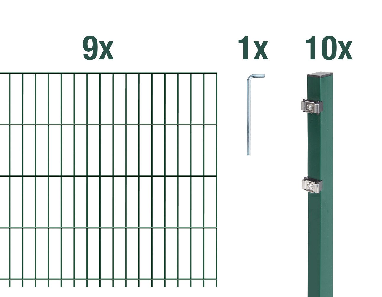 • Dieses Doppelstab-Zaunset beinhaltet folgende Bestandteile: 9 x Doppelstabmatte, 10 x Zaunpfosten, 1 x Innensechskantschlüssel.