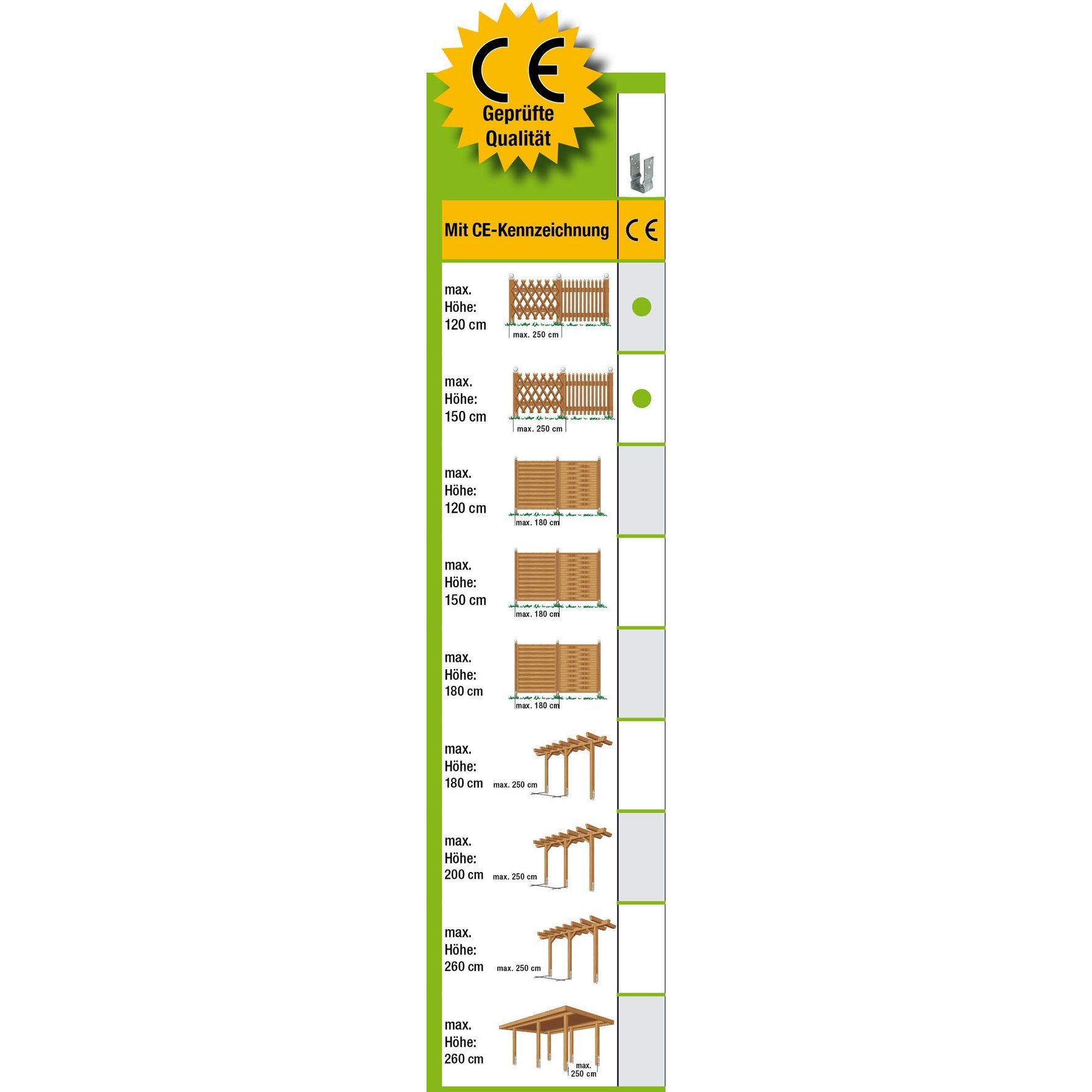 Pfostenträger sind für die Befestigung von Holzstützen und −pfosten als tagende Bauteile in leichten Bauwerken vorgesehen. Statisch geeignet für hohe Flecht− und Sichtschutzzäune und für Holzkonstruktionen (z.B. Carports, Pergolen, etc,) sowie Holzzäune gemäß Richtwerttabelle. Passende Schrauben finden Sie, wenn Sie in unserem Shop nach"Sechskantschraube 91mm" suchen.