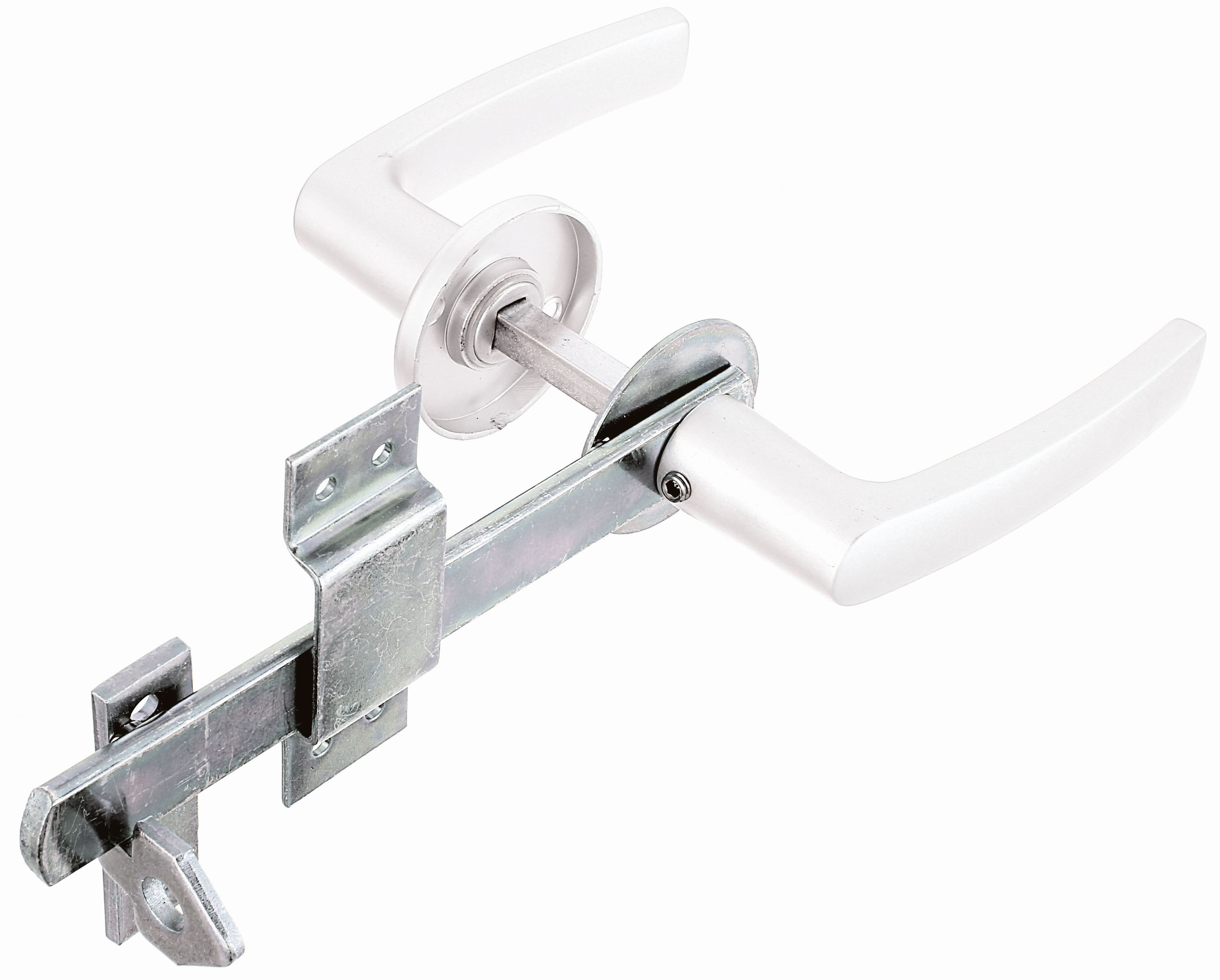 • Ein Set bestehend aus: einer Drückergarnitur mit Rosetten und einem Spezial-Riegelverschluss und einem Anschlaghaken.