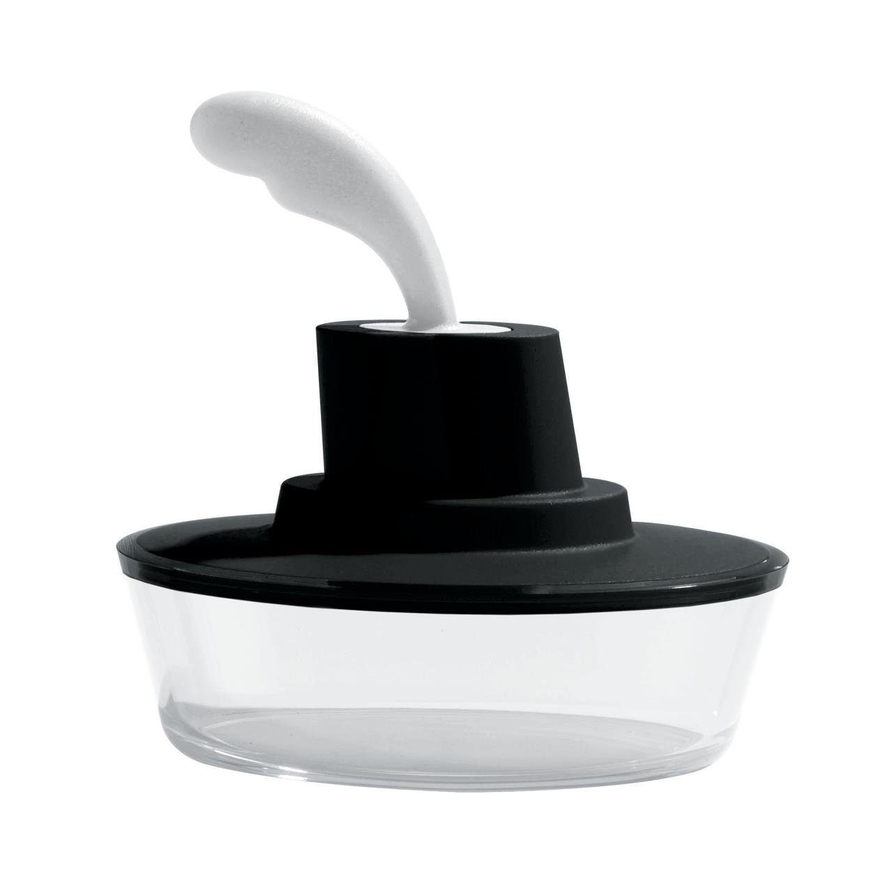Behälter aus thermoplastischem Harz, schwarz mit Spachtel aus Edelstahl 18/10.