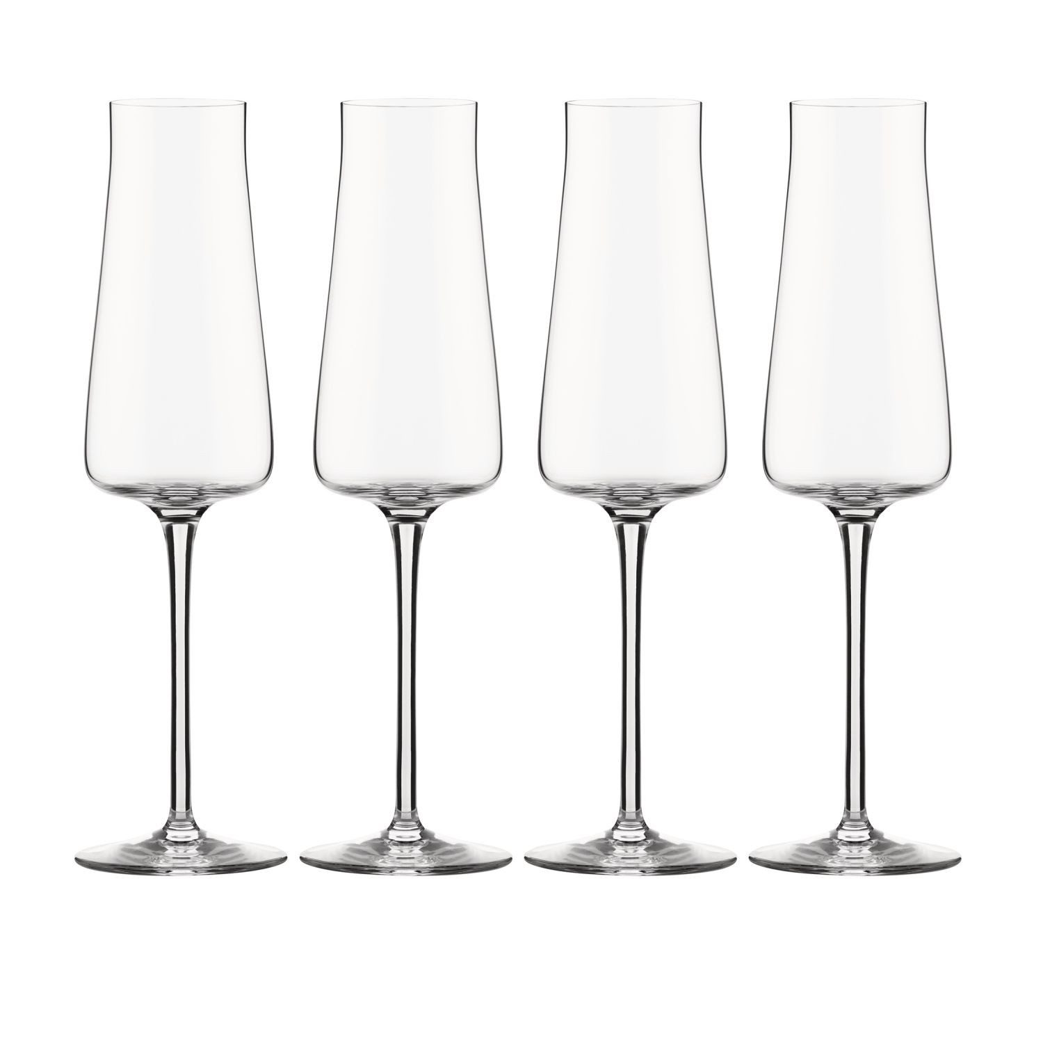 Die Glas-Kollektion Eugenia von Alessi wurde vom japanischen Designer Naoto Fukasawa entworfen, der sich von der Leidenschaft des Firmengründers Alberto Alessis für Wein inspirieren ließ. Alssi gründete dazu eigens das Unternehmen La signora Eugenia e il passero solitario“ (Dt. Frau Eugenia und der einsame Spatz), welches Produkte in Flaschen nach einem Entwurf Leonardo da Vincis vertreibt. Ausgehend von dieser besonderen Flaschenform entwickelte Fukasawa die minimalistische Glas-Serie Eugenia, deren besonderes Merkmal der stumpfe Winkel (jap. donkaku“) ist. Dieser Winkel wird bei Berühren des Glases mit den Lippen spürbar, ein einzigartiges Detail, was für die konische Form des Glas unterstützt wird. Die vielseitige Kollektion Eugenia wird allen Anforderungen an Nutzen und Verkostung gerecht, so wird der Weingenuß zu einem Moment der Meditation und Selbstfürsorge. Die Sektflöte besteht wie der Rest der Serie aus Kristallglas, sie ist mit einem Volumen von 260 ml für Sekte und Champagner aller Art geeignet. Im Set enthalten sind vier spülmaschinengeeignete Gläser.