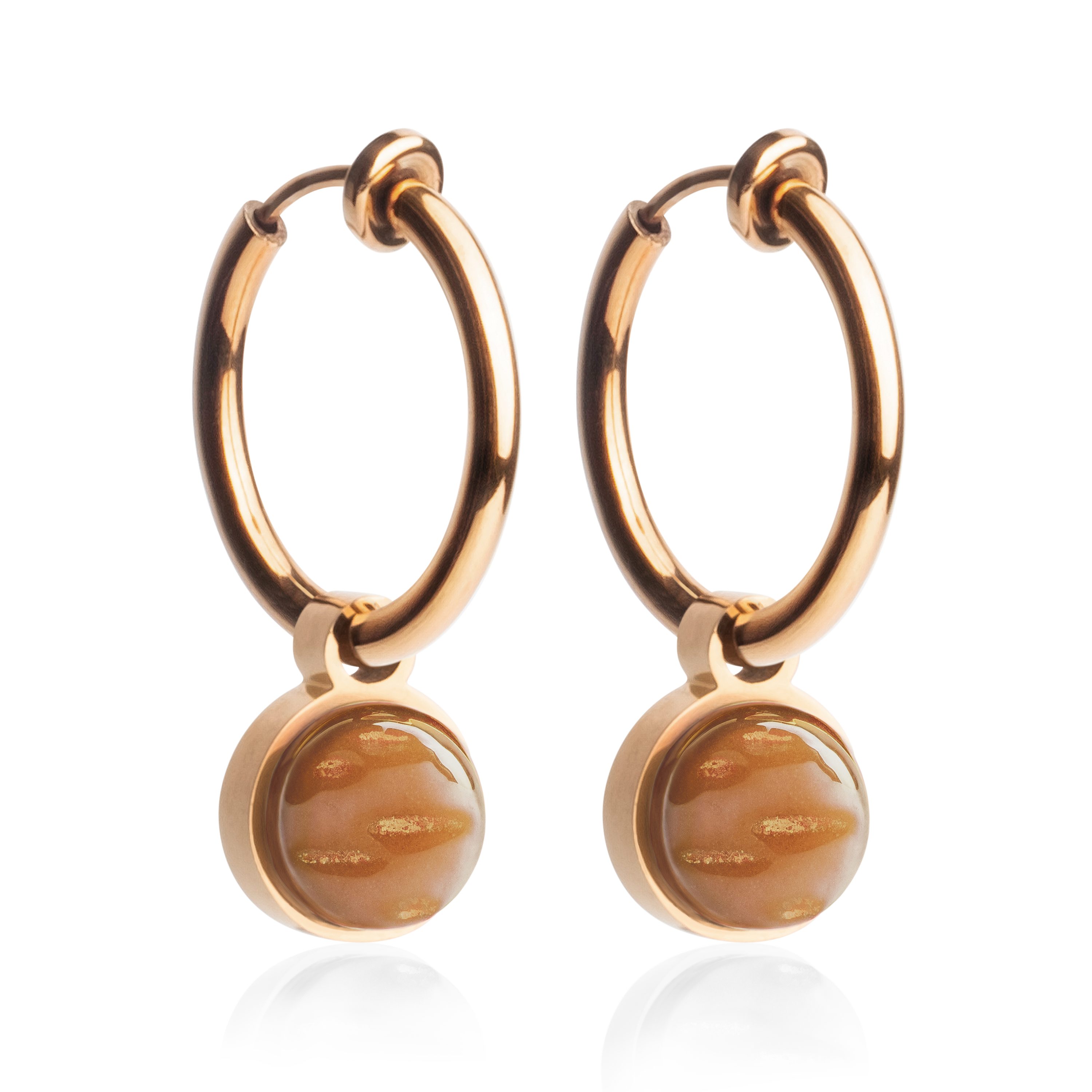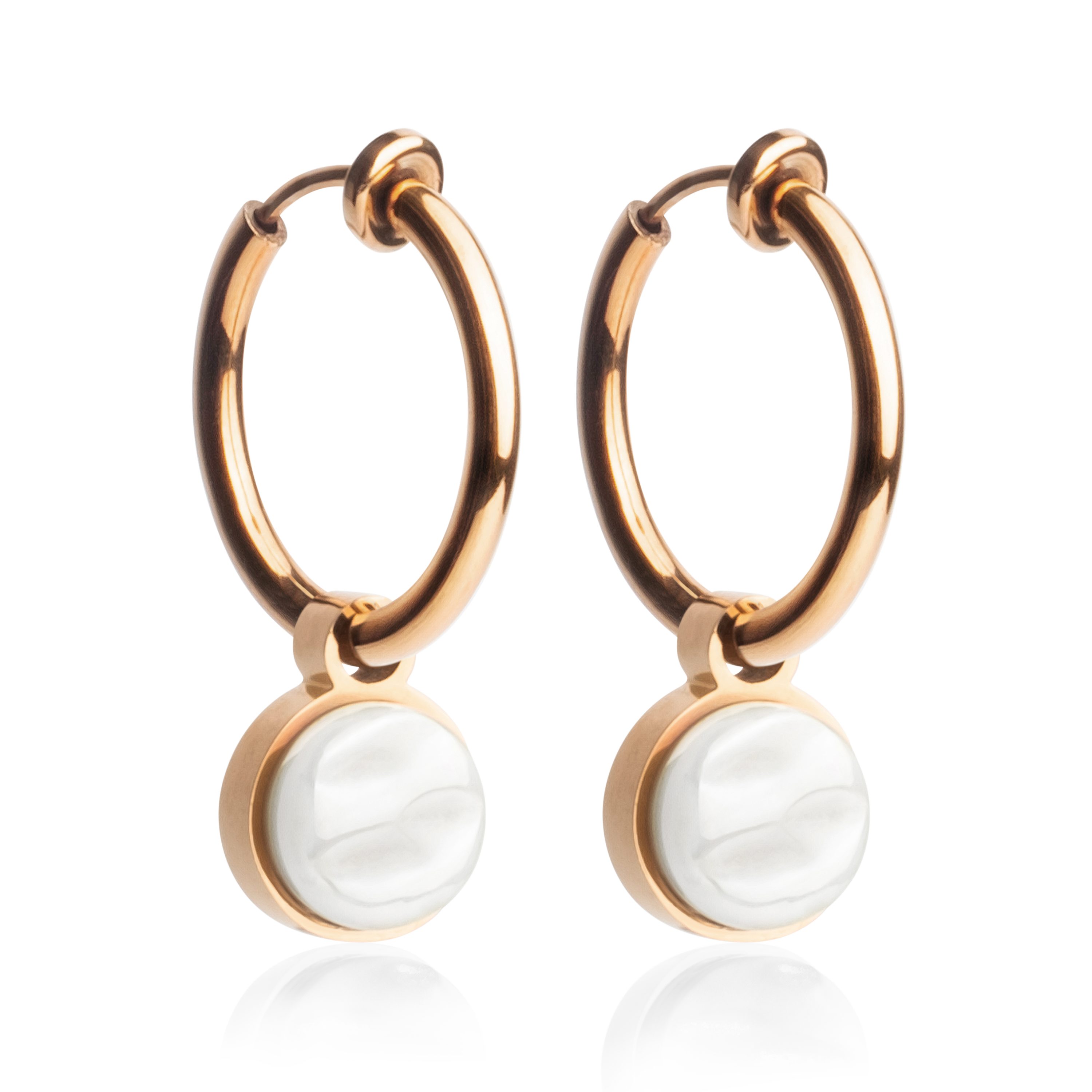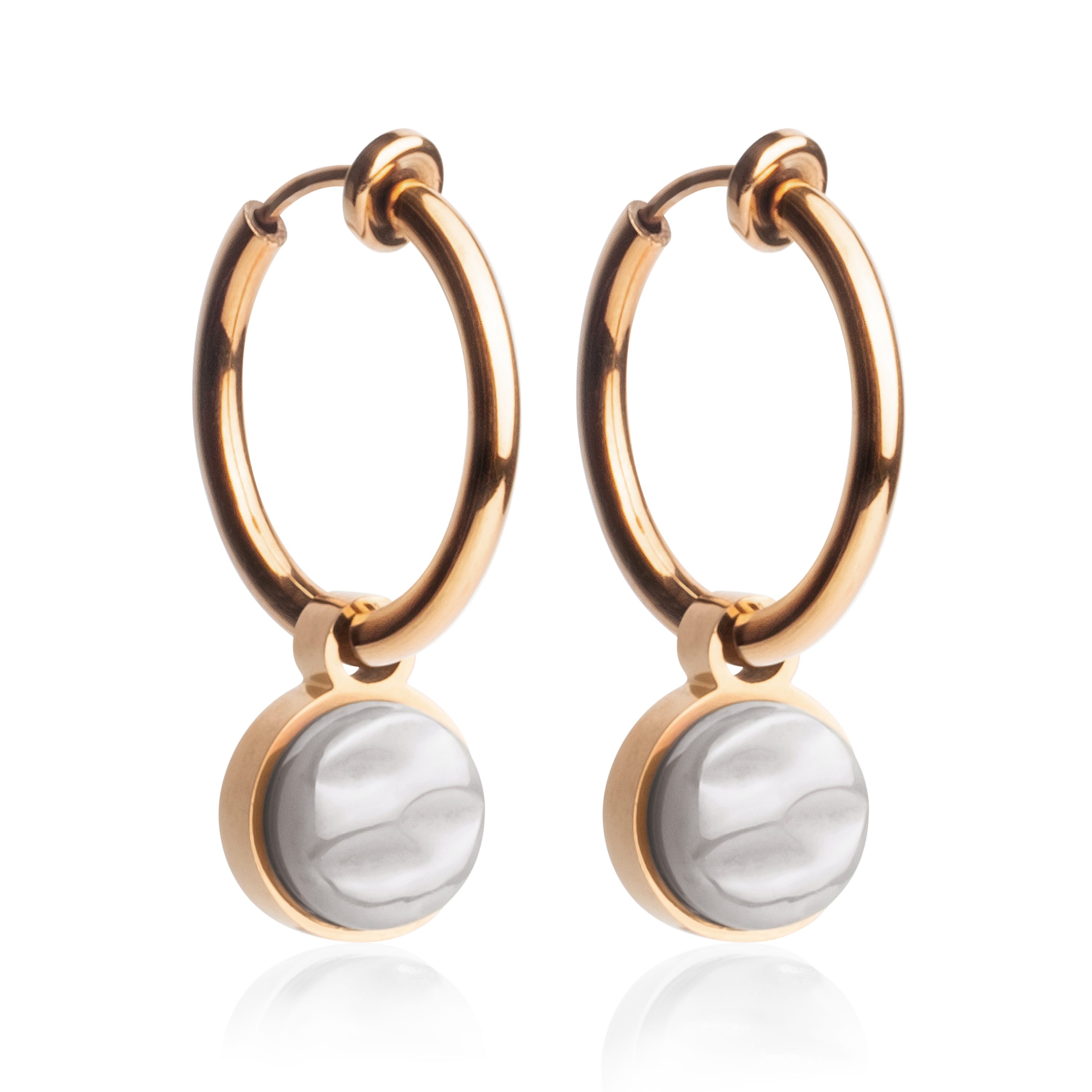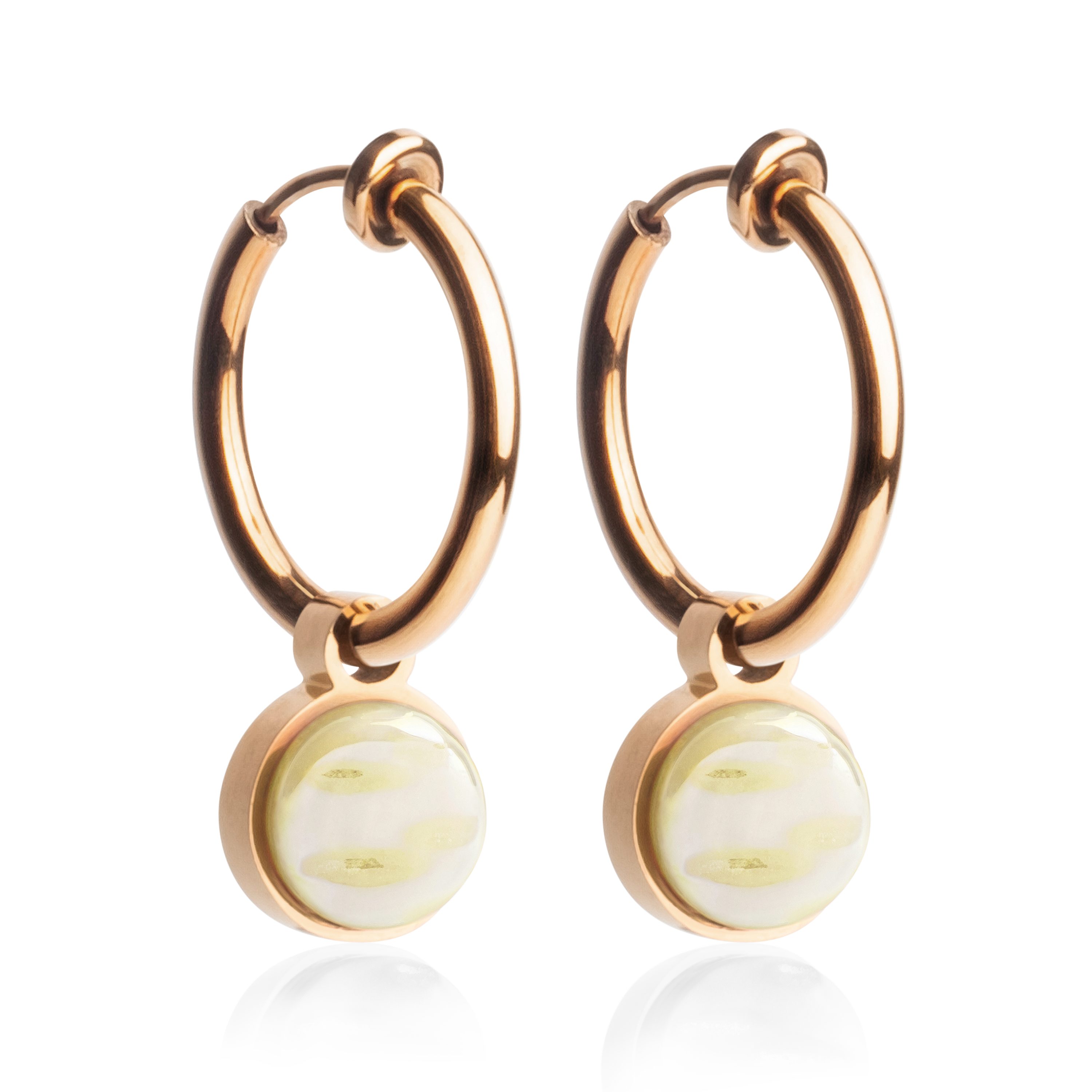 Du möchtest einen Hingucker am Ohr, hast aber keine Ohrlöcher? Dann sind unsere Ohrclip Creolen genau das Richtige für Dich. Das Besondere ist der austauschbare Anhänger, der sich im Handumdrehen wechseln lässt. Die Clip Creolen aus hochwertigem Edelstahl sind in drei Metallfarben und 20 Steinfarben erhältlich. Die abnehmbaren Anhänger gleiten geschmeidig über die Clips und verleihen jedem Look eine individuelle Note. Der weiche Federverschluss sorgt für einen bequemen Sitz. Die Anhänger bestehen aus recyceltem Glas mit einer strahlenden Perlmuttbeschichtung, die den Charme von Halbedelsteinen versprüht, ohne dabei endliche Ressourcen zu verbrauchen. Die Ohrclips sind wasserabweisend und langlebig und werden auf faire Weise in Europa hergestellt. Bereit für mehr Farbe? Die Anhänger sind auch einzeln erhältlich, sodass Du nach Belieben neue Farbakzente setzen kannst. MAßE: Размер der Creolen – ⌀ 18 mm, 2 mm dick Размер des Steins – 8mm Размер der Fassung – 9x4mm MATERIAL: Stein – recyceltes Glas Creolen – rostfreier Edelstahl / gold, silber oder roségold (nicht vernickelt) Für Всеrgiker geeignet