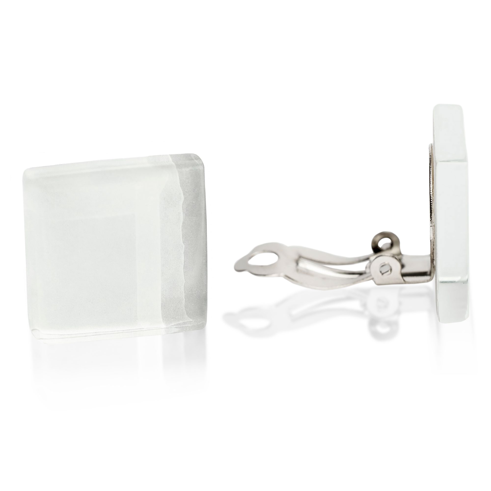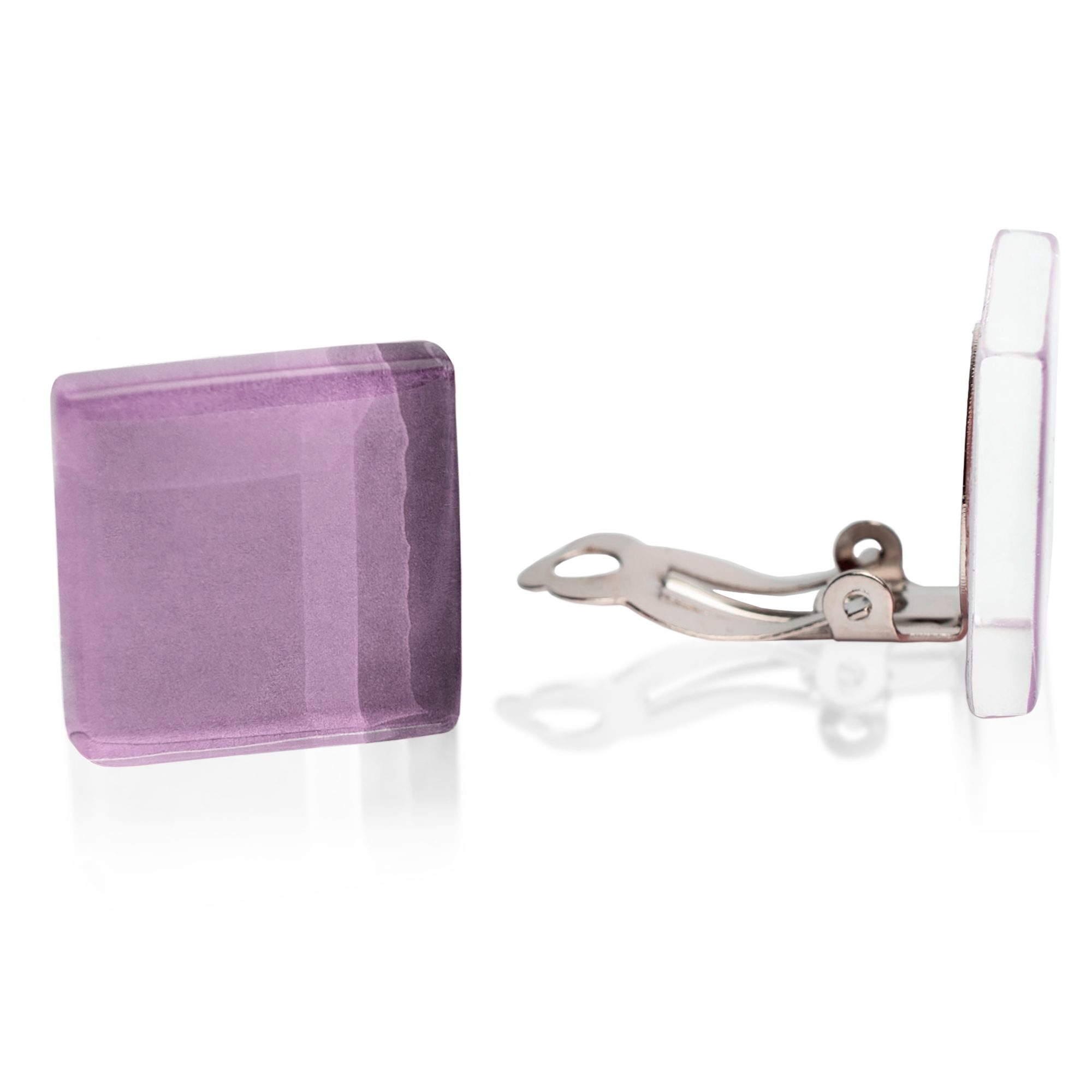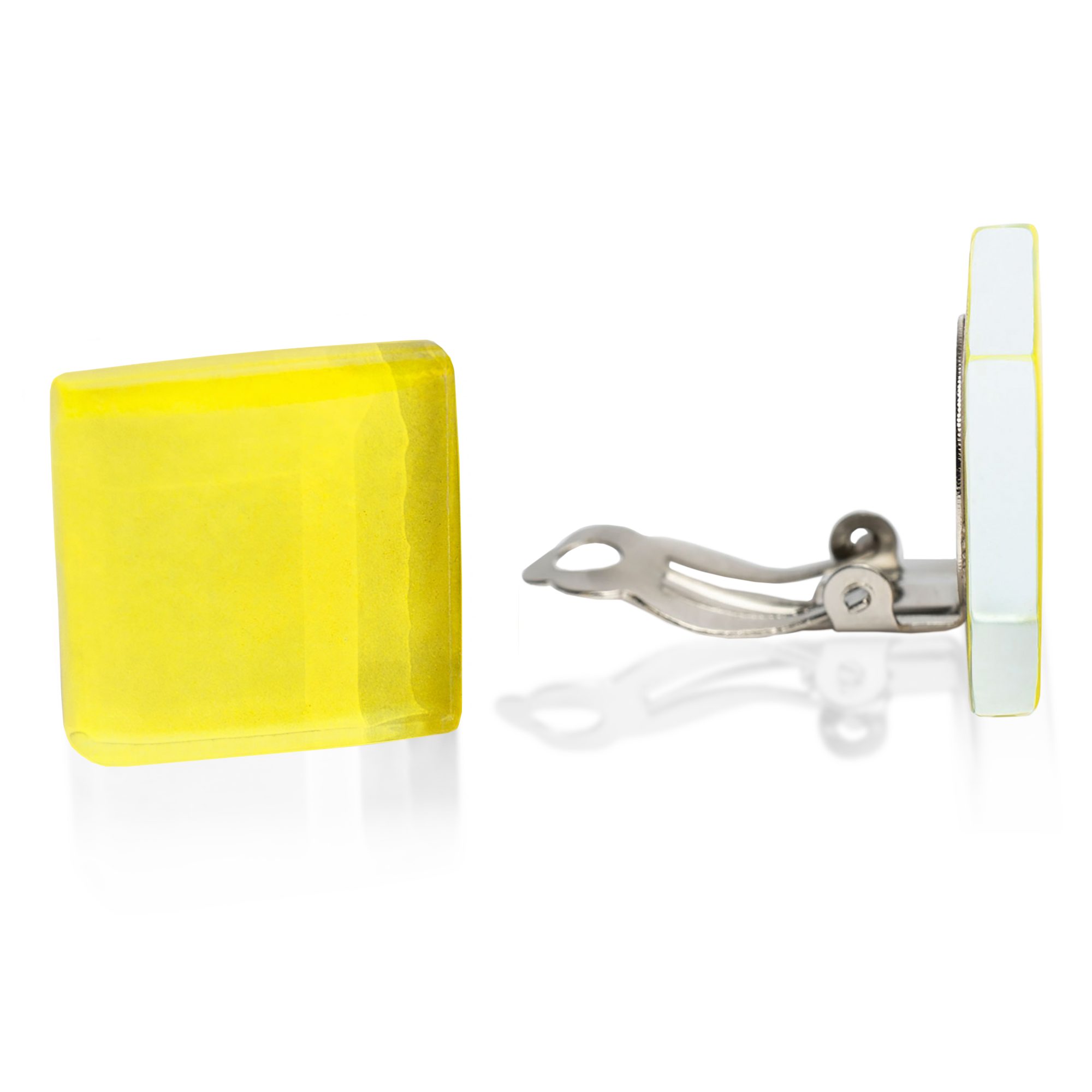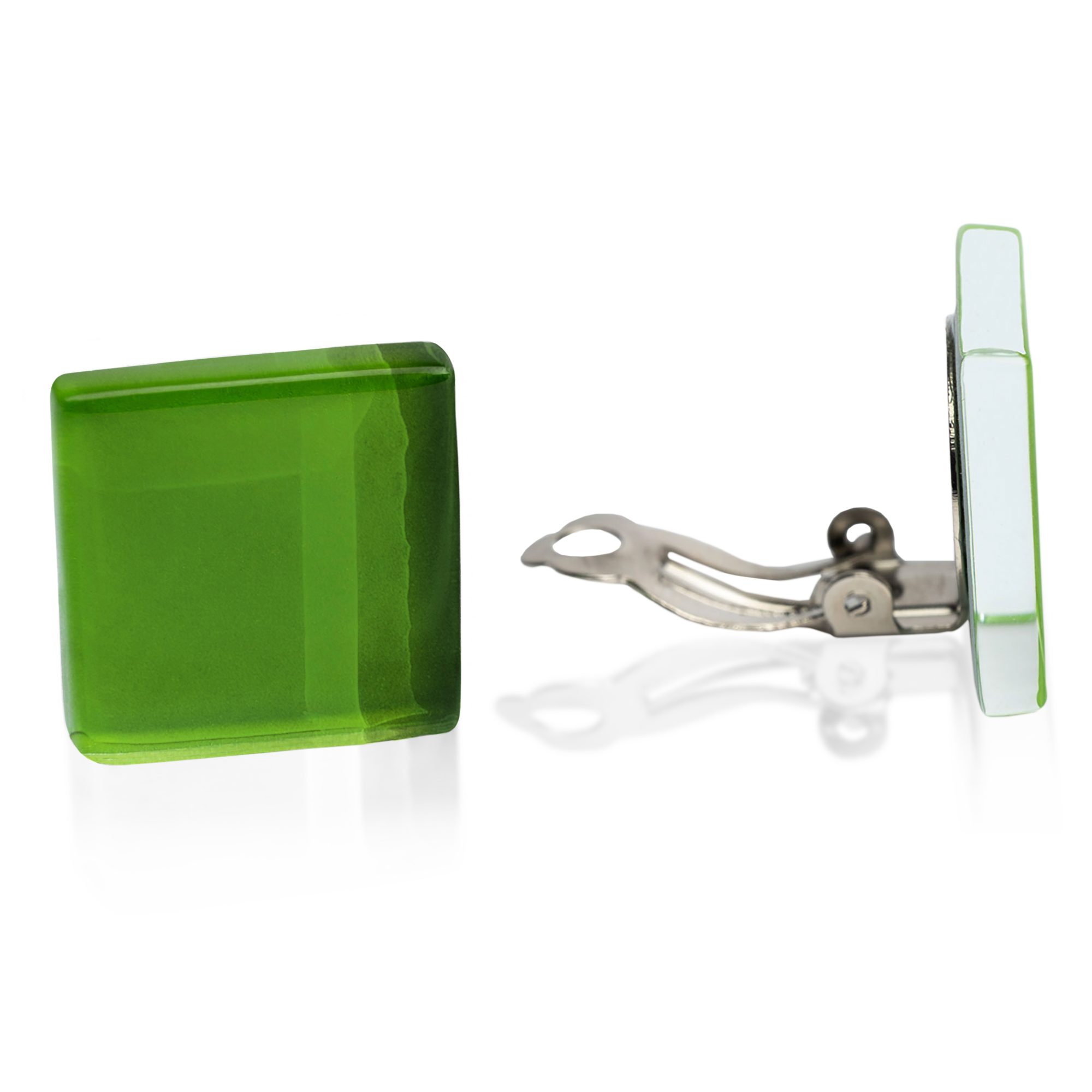 UNIQUE STATEMENT: Bunte Clip-Ohrringe mit leuchtend beschichteten Glassteinen – quadratisch (20 × 20 × 3 mm), farbenfroh und ein echter Hingucker für Dein Ohr.