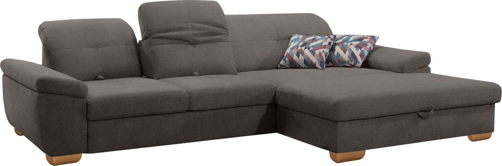 Durch die hochwertige Wellenunterfederung wird die Sitzfläche des Ecksofas »Nadira« von alina gut gefedert und bleibt dauerhaft elastisch. Worüber du dich auch freuen kannst, ist die Sitztiefenverstellung, durch die große und kleine Personen gleichermaßen bequem Platz nehmen können. Von vorne betrachtet ist die Recamiere nach rechts ausgerichtet. Bei etwa 120 Kilogramm liegt die maximale Belastbarkeit pro Sitzplatz. Aus Massivholz gefertigt, bestechen die eichefarbenen Füße durch eine unverwechselbare Optik.