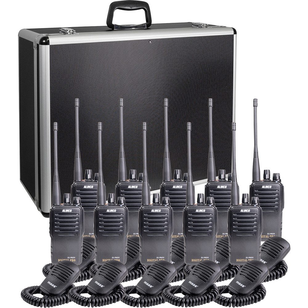 10 x Alinco DJ-PAX4 Handfunkgerät + 10 x Akkupack EBP-101 (Li-Ion/ 7,4 Volt/ 1800 mAh) + 230 Volt Tischlader (Standlader) Antenne + Gürtelclip EBC-51 & Trageband + Bedienungsanleitung + 10 x KEP-360-K Lautsprechermikrofone für Alinco DJ-PAX-4 + Koffer