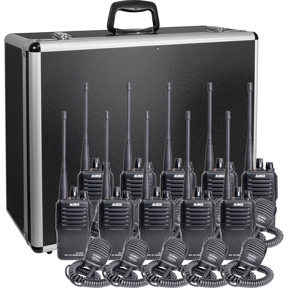 10 x Alinco DJ-VX-46 Handfunkgerät + 10 x Akkupack EBP-101 (Li-Ion/ 7,4 Volt/ 1800 mAh) + 230 Volt Tischlader (Standlader) + eingebaute Antenne + Gürtelclip EBC-51 & Trageband + Bedienungsanleitung + 10 x Alinco EMS-76 Lautsprechermikrofon + Koffer