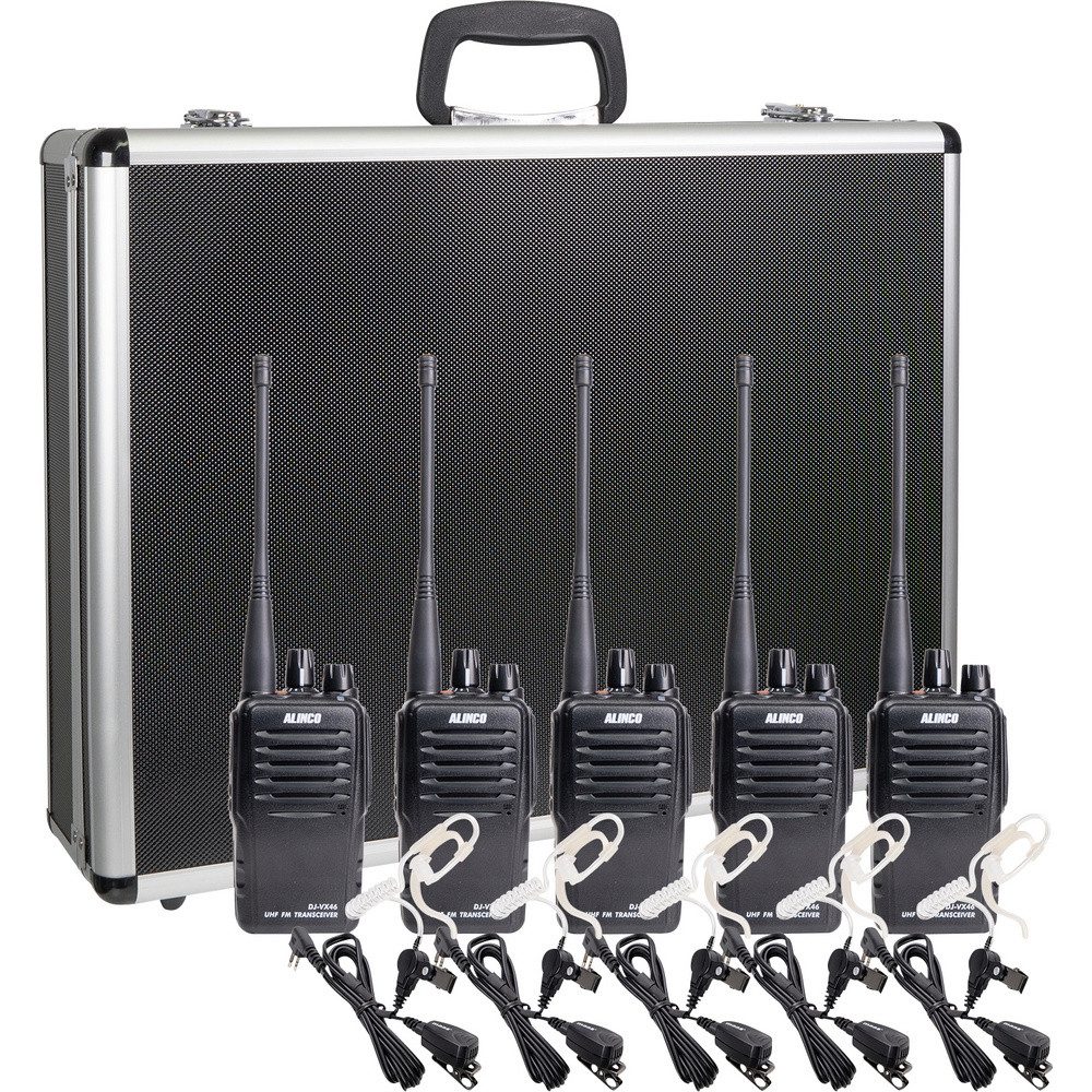 5 x Alinco DJ-VX-46 Handfunkgerät + 5 x Akkupack EBP-101 (Li-Ion/ 7,4 Volt/ 1800 mAh) + 230 Volt Tischlader (Standlader) + eingebaute Antenne + Gürtelclip EBC-51 & Trageband + Bedienungsanleitung + 5 x KEP-24-AL Schallschlauch Headset für Alinco DJ-VX-46E + Koffer