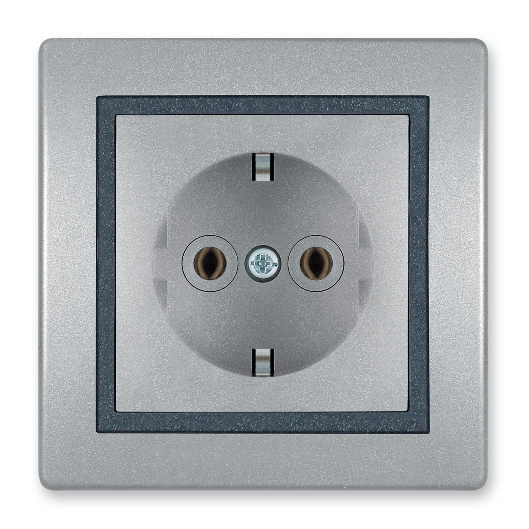 Die Aling Conel Schutzkontakt Steckdose aus der Serie Prestige Line gemäß Norm IEC 60884-1, kann als Unterputzinstallation im 60mm Ø Gehäuse mit Klemmen oder Schrauben verbaut werden. Farbe: Silber mit Zwischenrahmen in Graphit