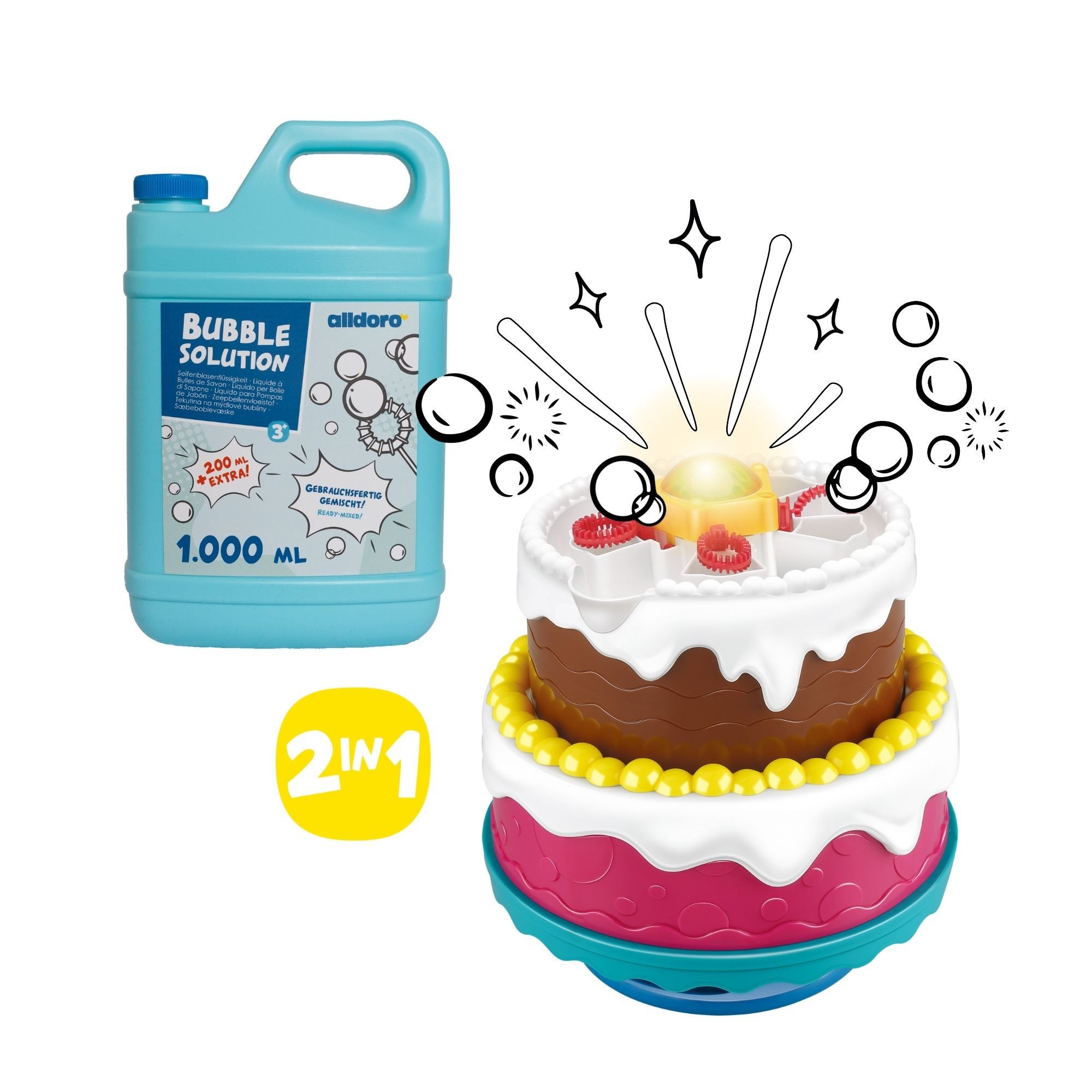 Unser 2in1 Seifenblasen-Party-Set macht jeden Kindergeburtstag zu etwas Besonderem. Die süße Seifenblasenmaschine im Tortenlook sorgt mit bunten LED-Lichtern und dem separat zuschaltbaren Geburtstagslied für strahlende Kinderaugen. Dazu bekommst du den praktischen XXL-Nachfüllkanister, damit der Spaß niemals ausgeht. Während die 118 ml Startflüssigkeit für die ersten magischen Momente sorgt, hält der 1,2 Liter Nachfüllkanister den Partyspaß am Laufen. So kannst du dich entspannt zurücklehnen und die Freude der Kinder genießen.