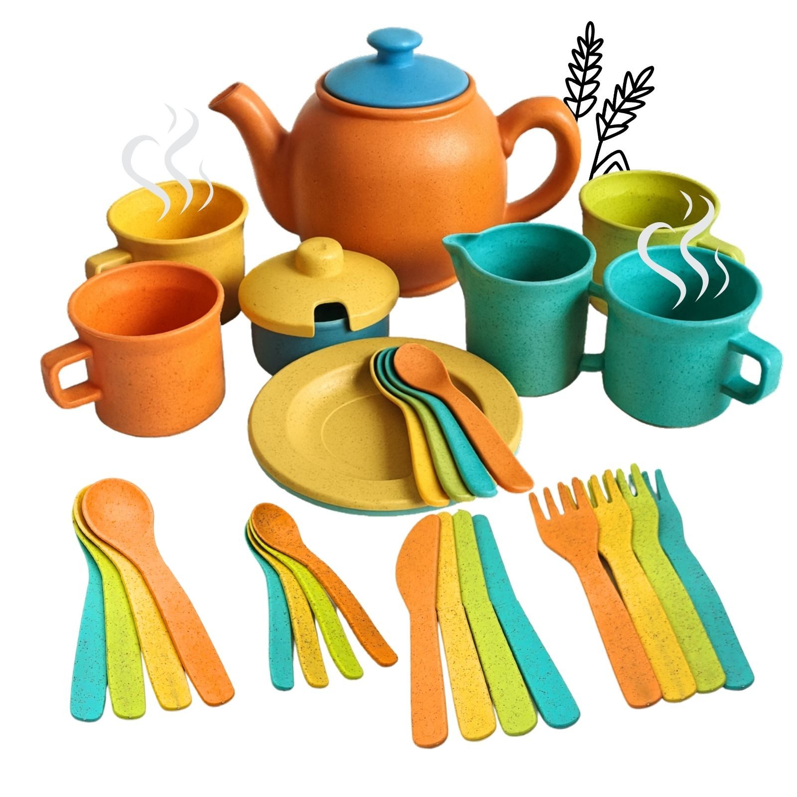 Unser Teeservice überzeugt durch besonderes Material: Die innovative Mischung aus Kunststoff und Weizenstroh reduziert den Erdöleinsatz bei der Herstellung. Все 32 Teile sind robust verarbeitet, pflegeleicht und überstehen wildes Kinderspiel problemlos. Das farbenfrohe Komplettset enthält: 1 Teekanne, 1 Milchkännchen, 1 Zuckerbecher, 4 Tassen mit passenden Untertassen, je 4 Messer, Gabeln, Esslöffel und Teelöffel - praktisch sortiert im mitgelieferten Besteckkasten.