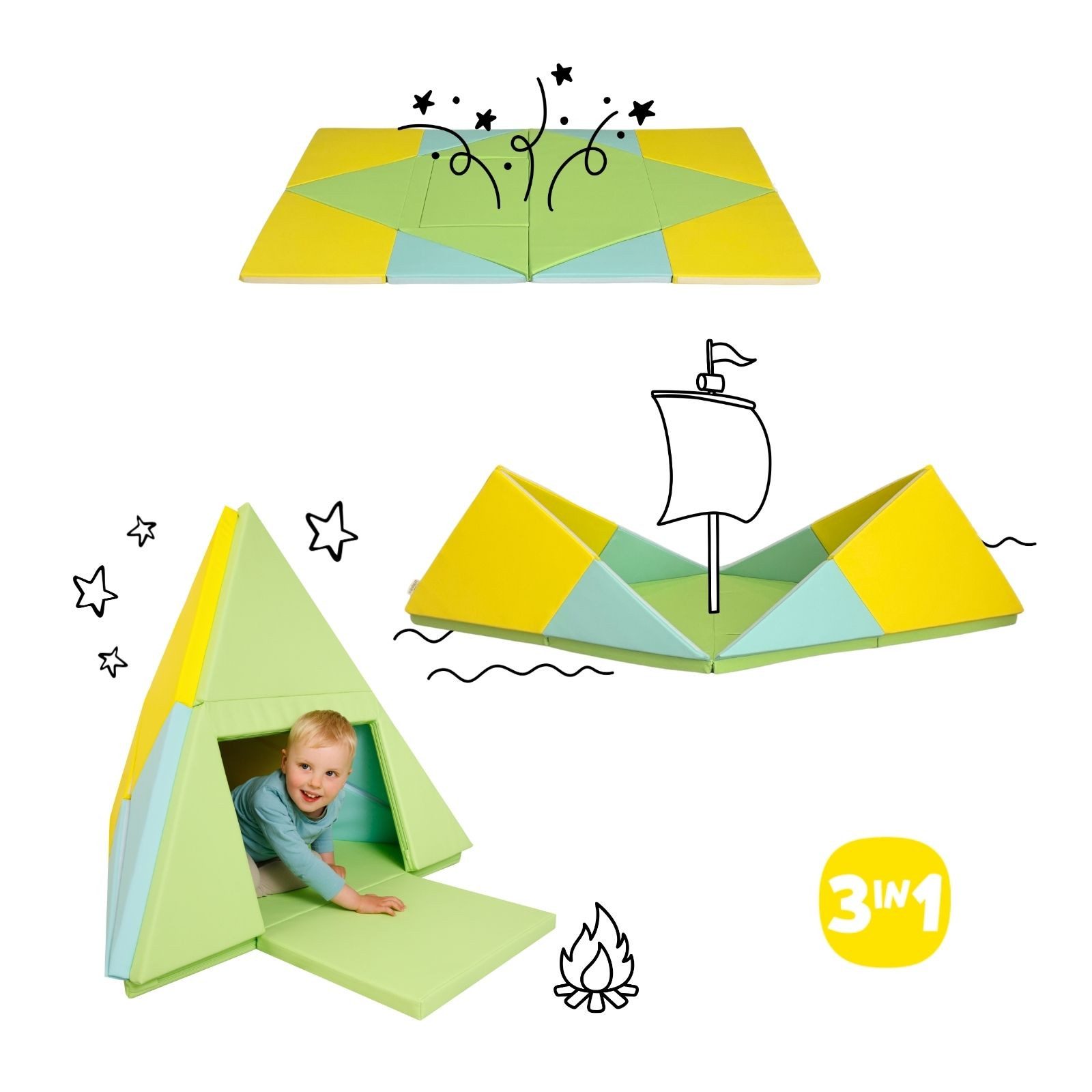 Funktionen | faltbar, verwandelt sich von Spielmatte in ein Kinderzelt und ein Spielboot |