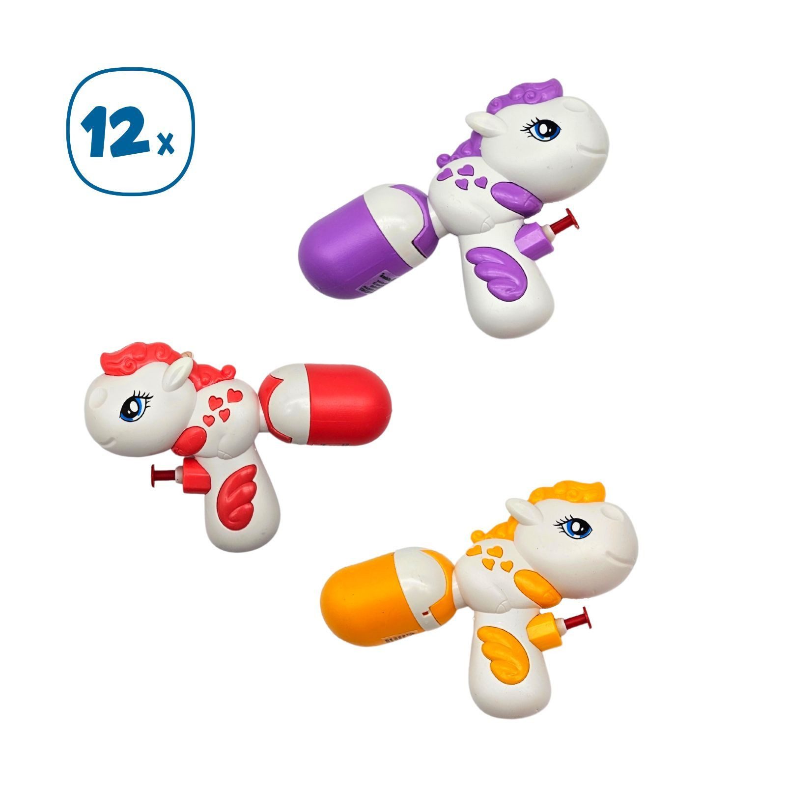 Die 12 kleinen Wasserpistolen im niedlichen Pony Design verwandeln jeden Garten in ein fröhliches Planschparadies. Mit ihren leuchtenden Farben in gelb, lila und rot sorgen diese Mini-Wasserspritzpistolen für strahlende Kinderaugen und erfrischende Spielmomente im Sommer.