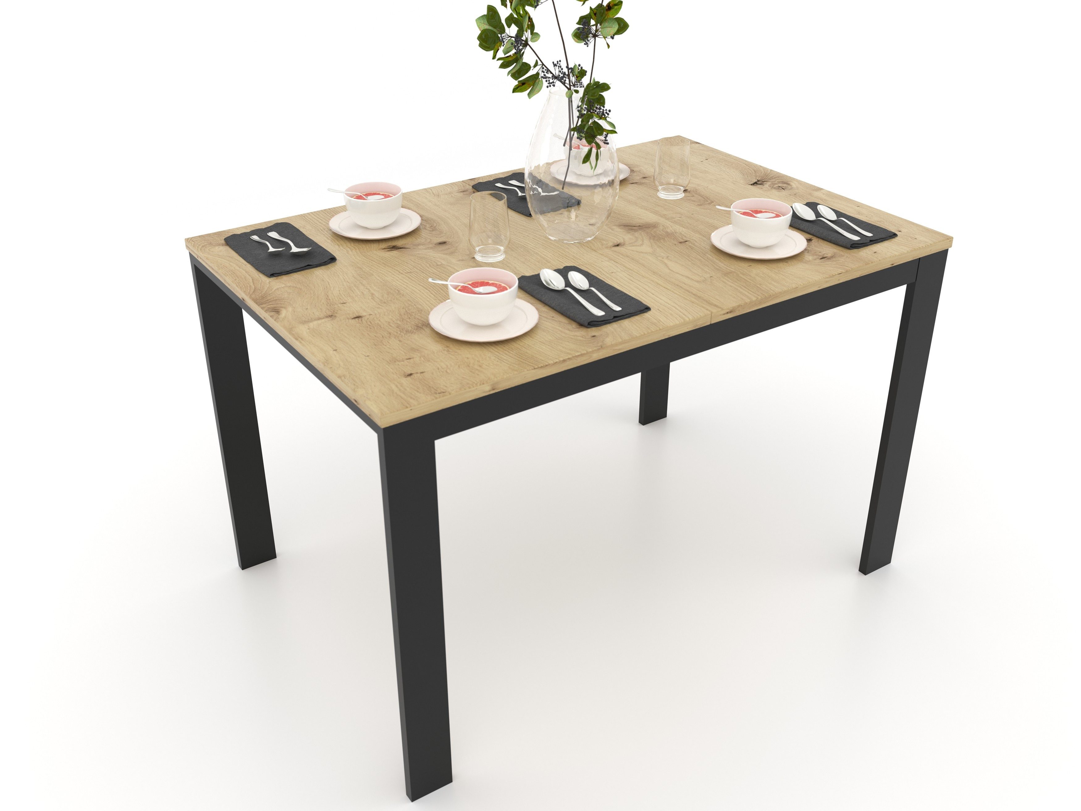 Die 22 mm starke Tischplatte in Artisan Eiche verleiht dem Tisch eine warme, natürliche Ausstrahlung und ist dank der robusten Laminierung besonders pflegeleicht und kratzfest. Die schwarz pulverbeschichteten Metallbeine sorgen für einen stabilen Stand und runden den Industrial-Look stimmig ab.