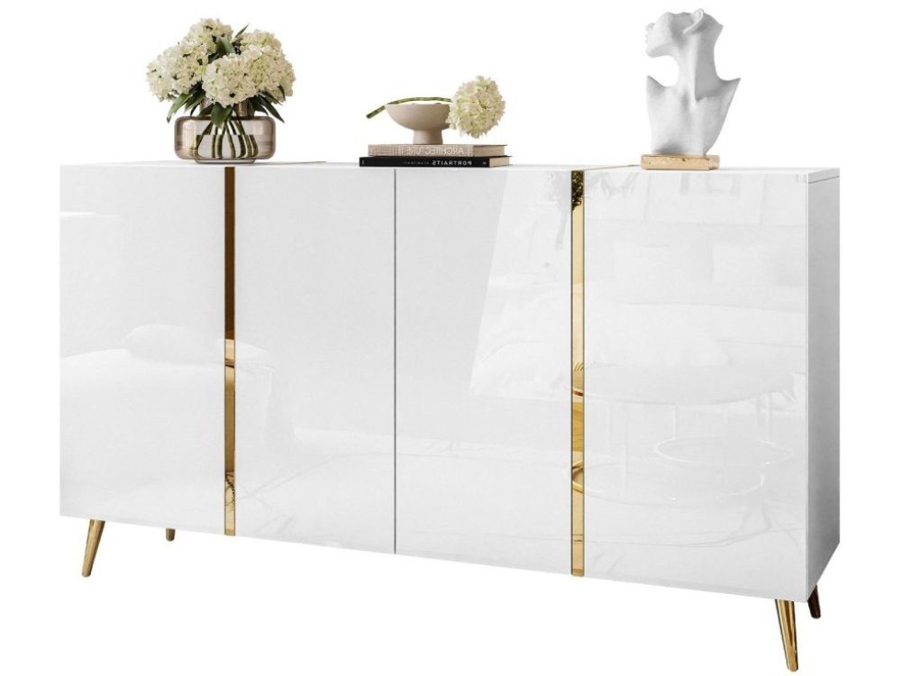 Goldene Akzente in Form von dekorativen Kanten und Griffen vervollständigen das Gesamtbild und verleihen der Kommode Prestige und zeitlosen Charme. Darüber hinaus ist die Kommode auf hohen, goldenen verchromten Metallbeinen montiert, die ihr modernes Design unterstreichen und einen eleganten Akzent im Raum setzen.