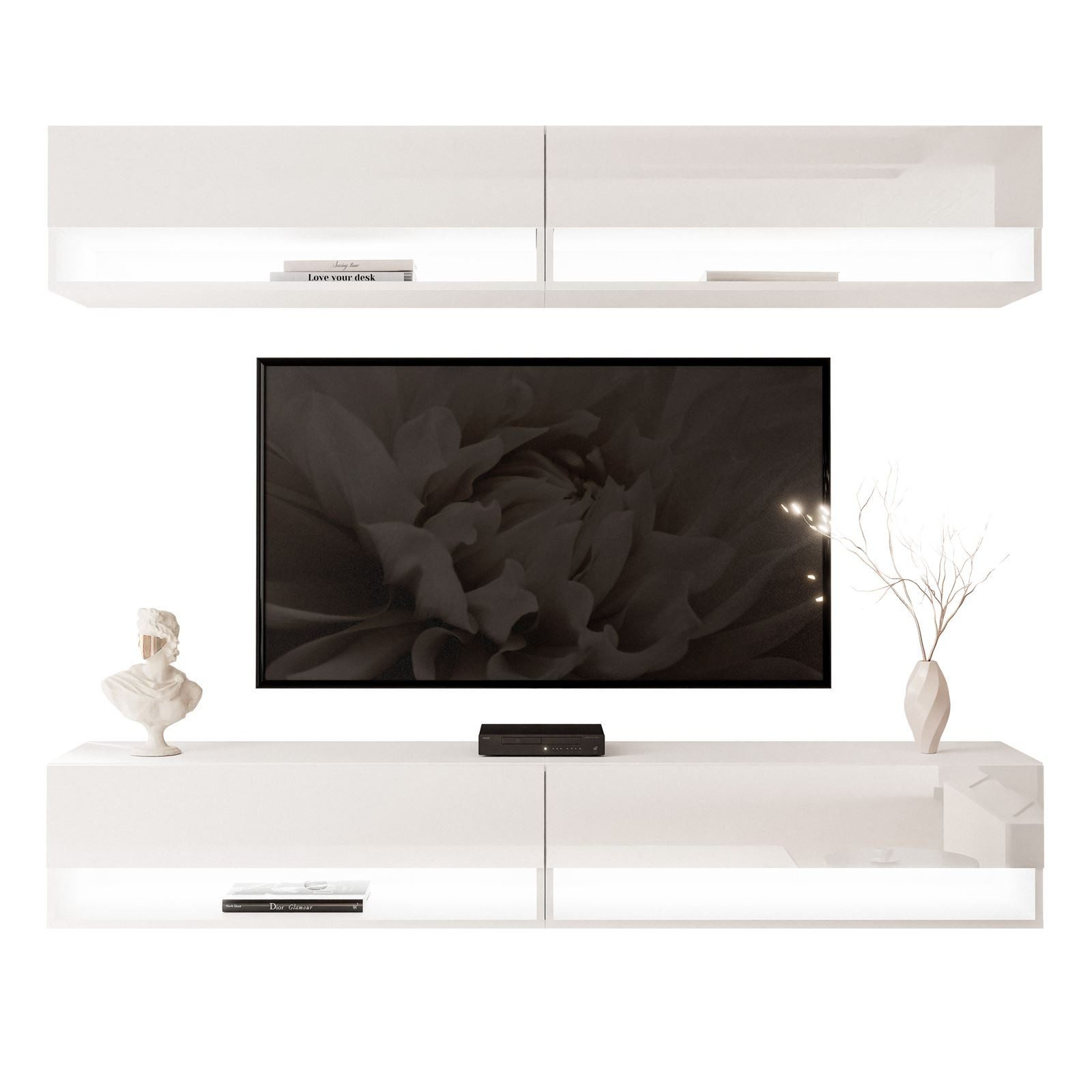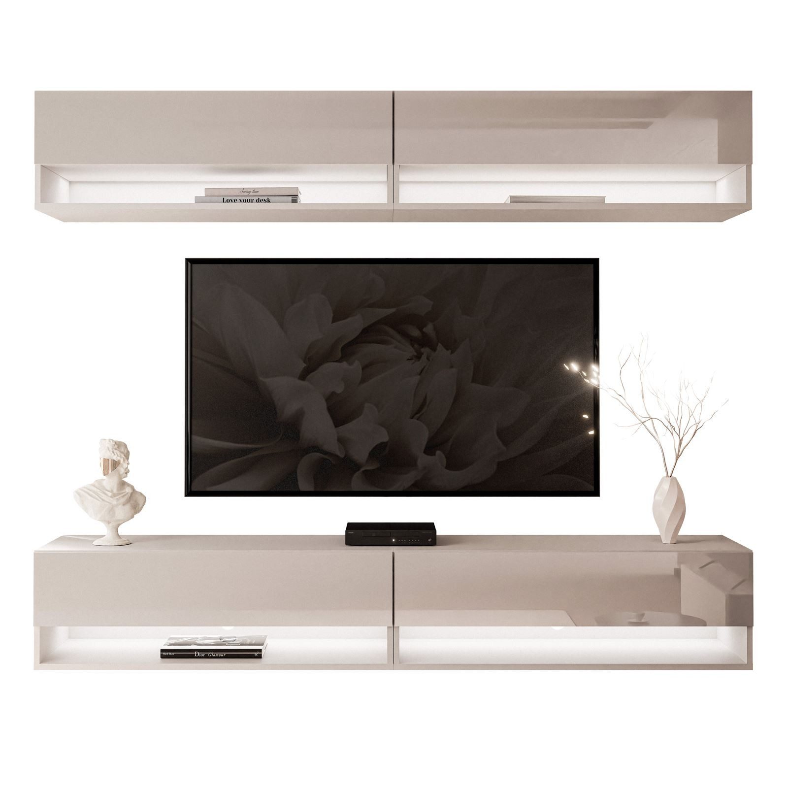 Fügen Sie Ihrem Interieur einen modernen Akzent hinzu, mit unserer stilvollen hängende Wohnwand, die in drei eleganten Farben erhältlich ist: