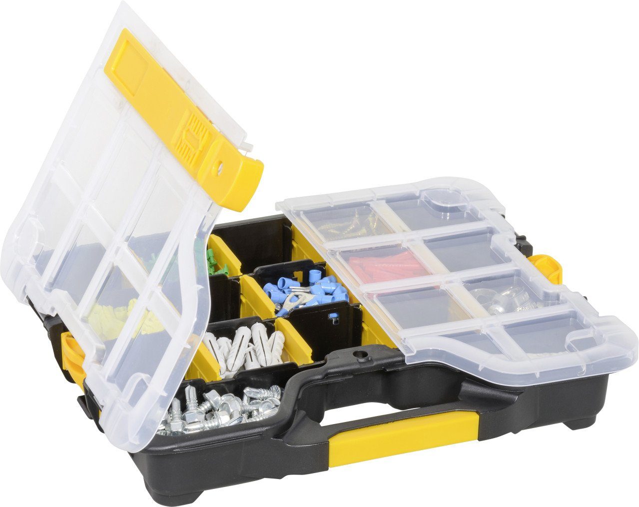 Produktdetails: Außenmaß: 295 mm x 235 mm x 55 mm | Farbe: schwarz, gelb, transparent | Material: Polypropylen | Individuelle Aufteilung mit den 12 flexiblen Trennstegen mit Schwalbenschwanzführung | Sichere Sortierung: Fächer schließen fest mit Deckel ab | Verbindungsclips ermöglichen den Transport von bis zu drei Менюskasten (max. 10 kg) | Erweiterbar mit Менюskasten EuroPlus Basic S 29 | Mit handelsüblichen Vorhängeschloss abschließbar | Einfache Deckelsicherung durch stabilen Verschlussschieber |