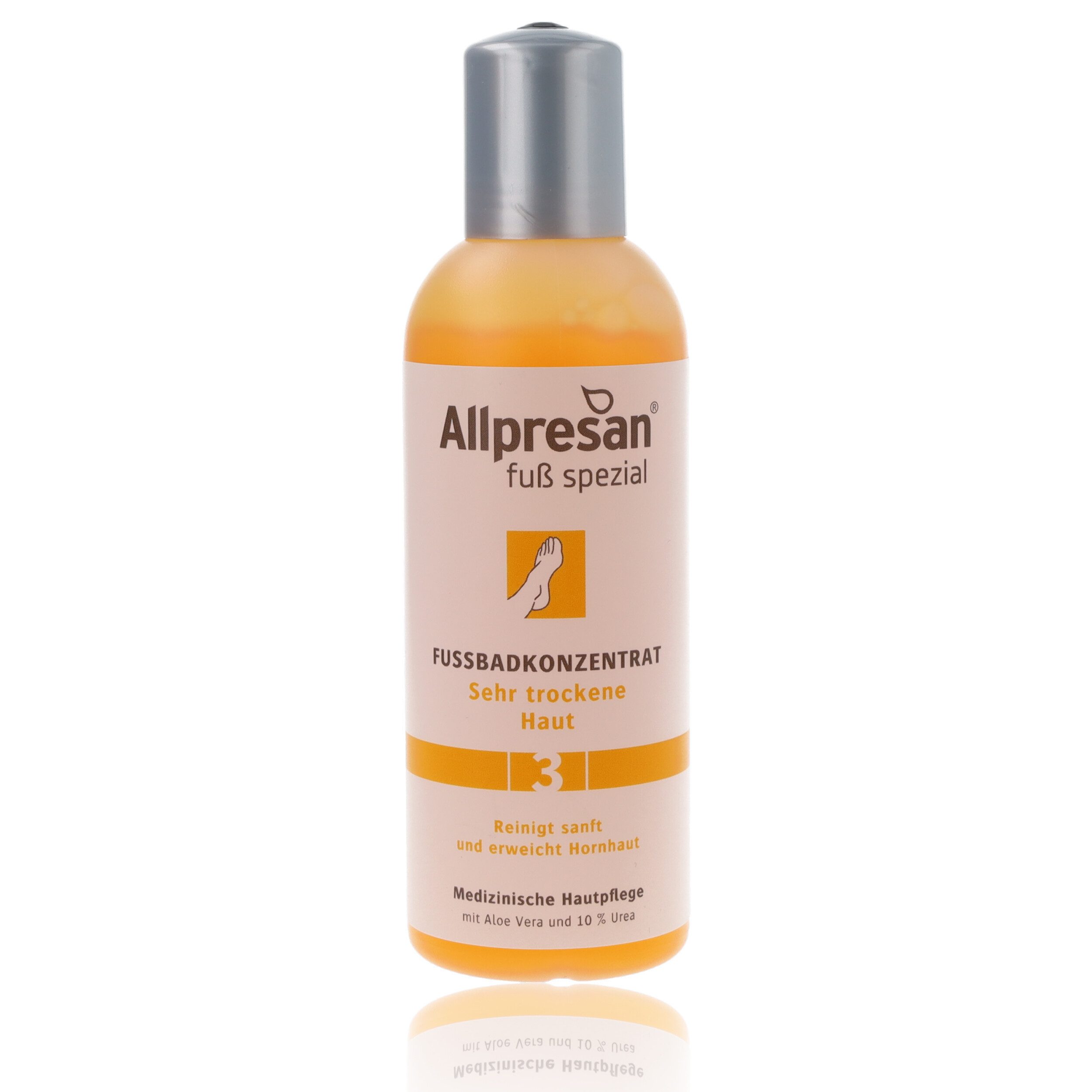 Sehr trockene Haut an den Füßen bedarf zusätzlicher Pflege. Dabei können Fußbäder eine wichtige Rolle spielen, denn gut gepflegte Füße sind widerstandsfähiger gegen bakterielle Infektionen und Fußpilz. Das Allpresan Fuß spezial Nr. 3 Fußbadkonzentrat mit 10% Urea und Aloe Vera ist speziell abgestimmt auf die Bedürfnisse sehr trockener Haut. Es reinigt die Haut an den Füßen mild und pflegend. Die Haut wird sanft durchfeuchtet. Hornhaut, Schwielen und Hühneraugen lassen sich leichter entfernen.