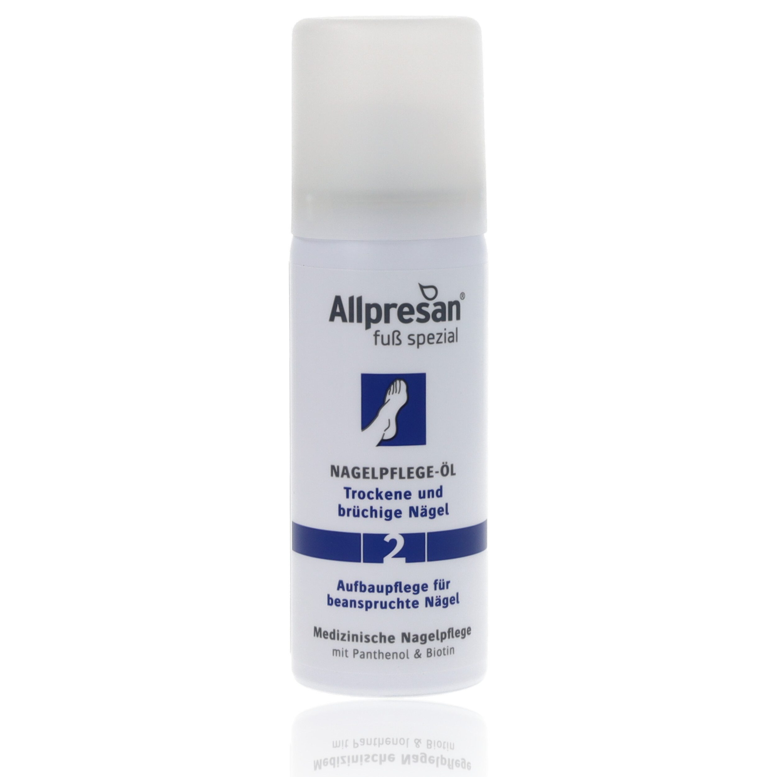 Das Allpresan Fuß spezial Nr. 2 Nagelpflege-Öl wurde speziell zur täglichen Aufbaupflege für trockene und brüchige Nägel entwickelt. Der reichhaltige Komplex aus Biotin, Panthenol und Algenextrakt macht trockene und brüchige Nägel spürbar geschmeidiger, lässt sie gepflegt aussehen und unterstützt ihre Regeneration. Zudem pflegen die wertvollen Inhaltsstoffe die Nagelhaut und tragen dazu bei, Verhornungen der Nagelfalz vorzubeugen.