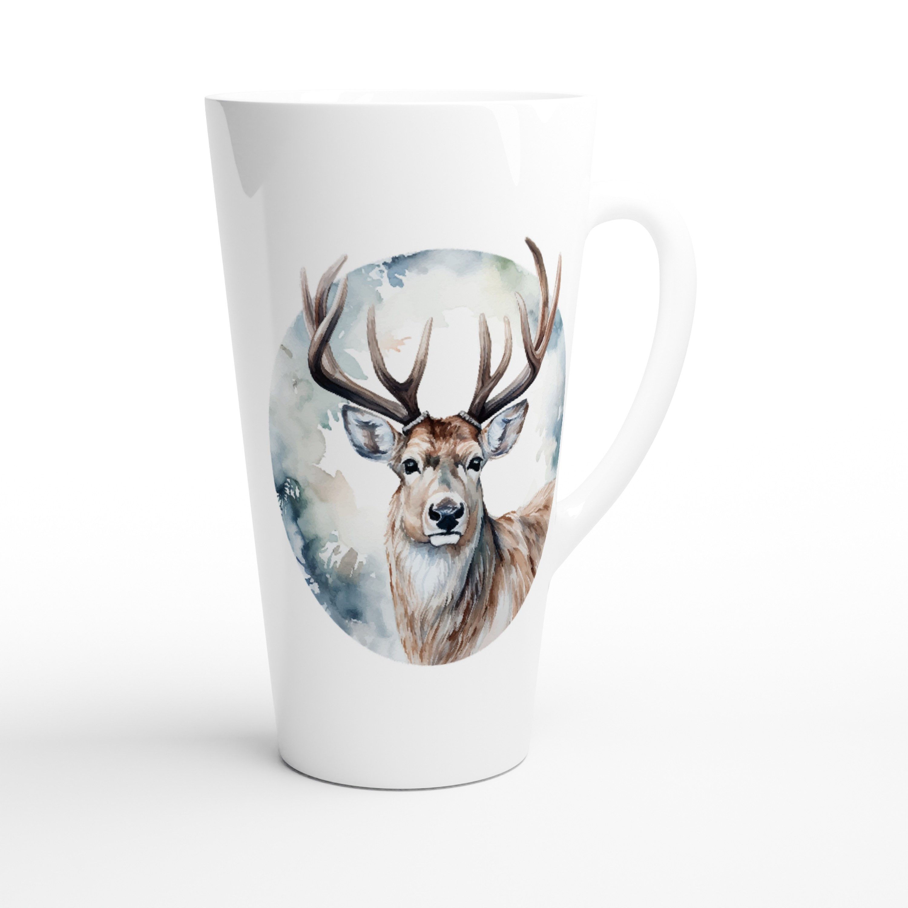 Die auf Vorder- und Rückseite kunstvoll aufgetragenen Zeichnungen eines majestätischen Hirsches verleihen diesem Becher einen Hauch von Naturverbundenheit und Eleganz. Die glänzend weiße Oberfläche bildet den perfekten Hintergrund, auf dem die lebendigen und detailreichen Drucke wunderbar zur Geltung kommen. Jedes Detail wurde sorgfältig bedacht, um ein Produkt zu schaffen, das nicht nur schön anzusehen ist, sondern auch eine Geschichte erzählt.