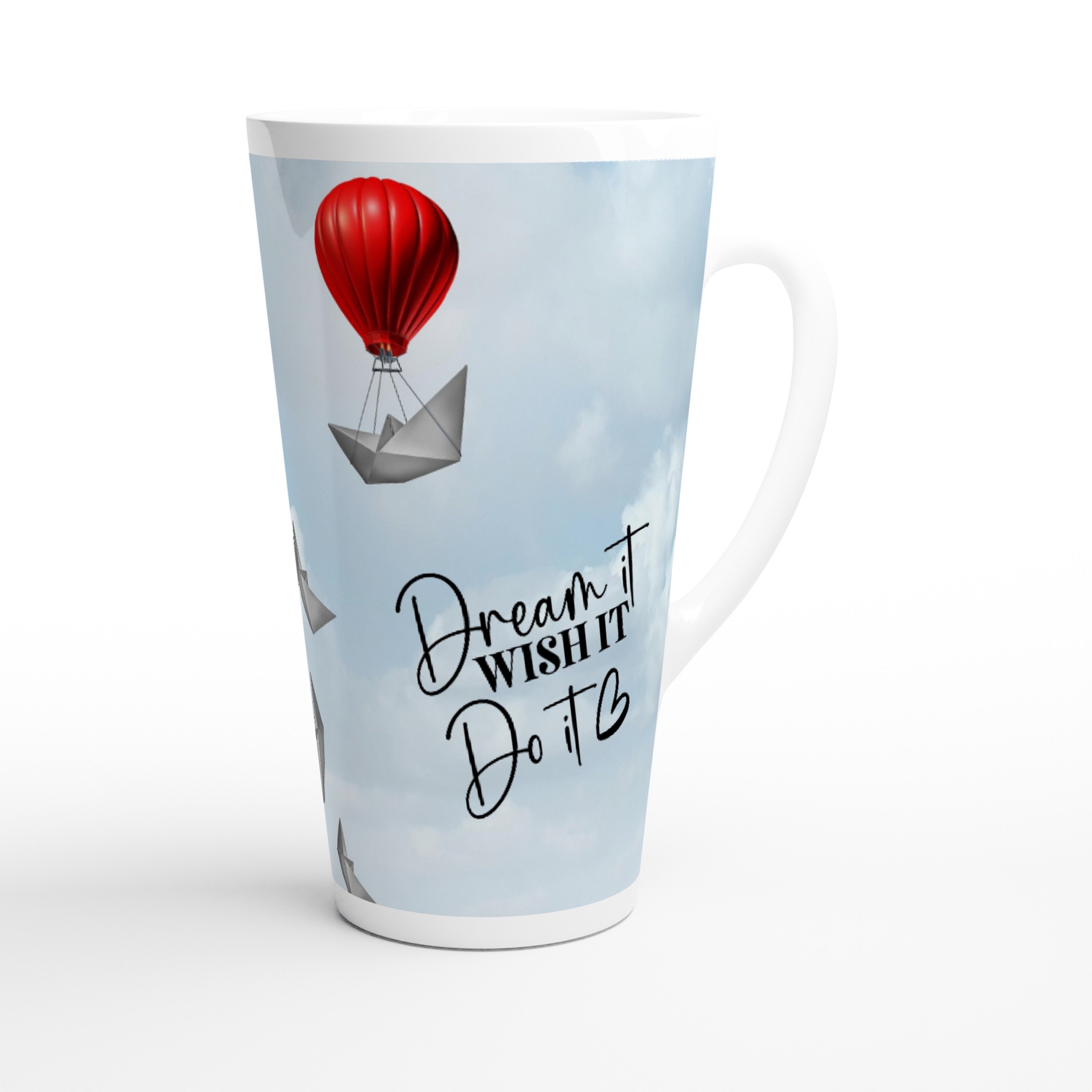 Und jetzt zum eigentlichen Highlight: Die liebevoll gestaltete Zeichnung rund um die Tasse. Kleine Papierschiffchen, die hilflos über eine Kante in die Tiefe stürzen, erinnern uns daran, dass das Leben manchmal chaotisch sein kann. Aber Achtung: eines dieser mutigen Schiffchen schwebt an einem Luftballon in die Lüfte – ein Symbol für Hoffnung und Abenteuer. Im Vordergrund prangt der inspirierende Schriftzug: "Dream it. Wish it. Do it." – eine kleine Erinnerung daran, dass alles möglich ist, wenn man nur daran glaubt.