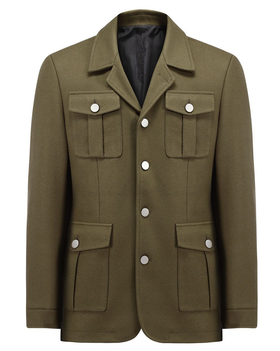Ein markanter Reverskragen betont die schmale Schulterpartie, während der vierteilige Knopfverschluss für strukturierte Optik und sicheren Sitz sorgt. Ärmel mit dezentem Knopfverschluss am Saum und der traditionelle Rückenschlitz unterstreichen die durchdachte Konstruktion.