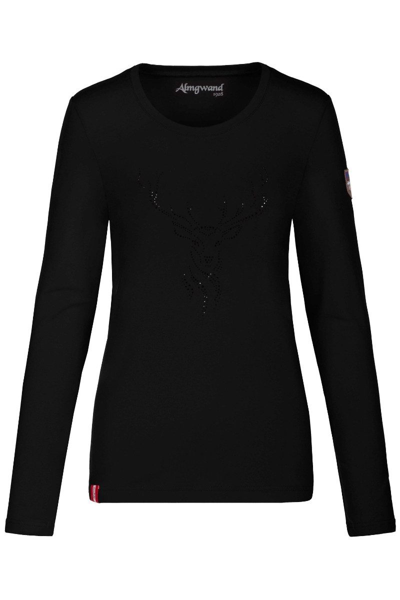 Das elegante, tailliert geschnittene Damen Longsleeve "Dreiländeralm" mit Rundhals-Ausschnitt besteht aus feiner Baumwolle mit Stretch-Anteil und bietet durch die Antipilling-Ausrüstung einen Schutz gegen Knötchenbildung. Ein entzückendes Hirschkopf-Motiv als Kontur, geformt aus schwarzen Glitzersteinchen in verschiedenen Größen, bildet das zentrale Design-Element. Rechts vorn am Saum befindet sich ein textiler Marken-Aufnäher und auf dem linken Ärmel ein Patch im Walk-Stil mit Marken-Motiv. Dieses Longsleeve lässt sich super zu Jeans, Lederhosen oder Outdoor-Styles kombinieren.