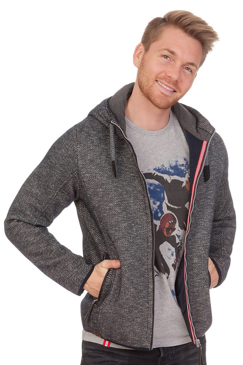 Bock, die sportliche Herrenjacke im urbanen Alpenstyle von der Marke Almgwand, hat ein rustikales Fischgrat-Muster und ist leicht tailliert geschnitten mit stylischen Teilungsnähten. Der Schaf- sowie Baumwoll-Anteil und die angenehme, teils gefütterte Innenseite garantieren einen tollen Tragekomfort. Die fesche, große Kapuze mit offener Kante und zwei Teilungsnähten verfügt über einen Tunnelzug mit einer breiten, gedrehten Kordel; die Enden der Kordel sind mit Leder-Stoppern geschmückt. Der Reißverschluss vorn, innenseitig verziert mit einer Kontraststoffborte, und die beiden mit je einem Reißverschluss bestückten Seitentaschen der trendy Outdoorjacke sind im Veloursleder-Look abgepaspelt. Anhänger aus Leder zieren die Zipper. Sowohl Bündchen als auch der Jackenabschluss sind mit Kontraststoff umsäumt. Auf dem linken Ärmel ist ein Leder-Patch in Wappen-Form mit Marken-Prägung angebracht. Diese angesagte Kreation passt perfekt zur Lederhose und lässt sich auch im Alltag super kombinieren. Bitte beachten Sie den Größenzuschlag bei Размер 58.
