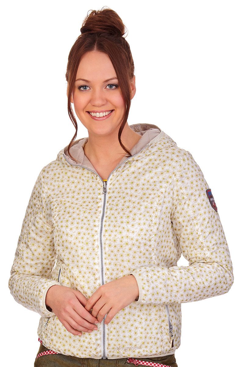 Diese fabelhafte, sportive Trachten Wendejacke für Damen mit Kapuze namens Wenderkogel ist eine entzückende Kreation von der Marke Almgwand 1928. Sie ist leicht tailliert geschnitten, mit HighTech-Wohlfühlvlies (Primaloft) von Polyfill wattiert und bietet durch den hohen Wärmerückhalt sowie die Atmungsaktivität einen tollen Tragekomfort. Eine Seite der attraktiven Damenjacke hat ein wundervolles Printmuster aus entzückenden Edelweiß-Blüten in gedecktem Grün, die andere, hellgraue Seite ein schickes Stepp-Muster. Die Blüten-Seite verfügt über zwei Eingrifftaschen mit sichtbarem Reißverschluss und Anhängern aus Hornmaterial und hat auf dem linken Ärmel ein schön besticktes Marken-Emblem aus Walk in Wappenform sowie eine Marken-Stickerei unten links über dem Saum. Die unifarbene Seite hat einen dezenten Marken-Stick links auf Brusthöhe sowie zwei Eingrifftaschen mit verdecktem Reißverschluss und kleinen Zippern in Rot. Auch hier ist auf dem linken Ärmel ein Almgwand-Patch in Wappenform angebracht. Der Reißverschluss vorn hat einen silbernen Zipper für beide Seiten und unten am Saum vorn gibt es einen kleinen Marken-Aufnäher. Die Kapuze, die Bündchen und der Bund sind mit Kontraststoff umsäumt.