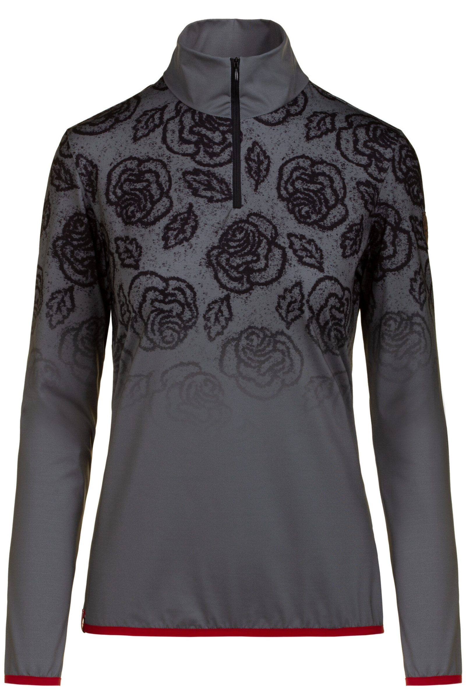 Dieses stylische, leicht taillierte Longsleeve "Deneckalm" für Damen aus Funktionsstoff bietet hervorragenden Tragekomfort und fantastische Bewegungsfreiheit. Der Kragen im Troyer-Stil ist in Uni-Grau gehalten und vorn mit einem verdeckten Reißverschluss in Schwarz ausgestattet. Das langärmelige Funktionsshirt ziert ein raffinierter Aufdruck aus Rosenblüten und Blättern als Kontur im Retro-Style, der von oben nach unten mit abnehmender Intensität verläuft. Auf dem linken Ärmel befindet sich ein Patch im Walk-Stil mit Marken-Motiv. Bündchen und Saum sind elastisch in Rot umsäumt. Ein textiler Marken-Annäher ziert den Saum vorn links. Dieses Longsleeve passt hervorragend zu unseren Ski- und Outdoor-Styles.