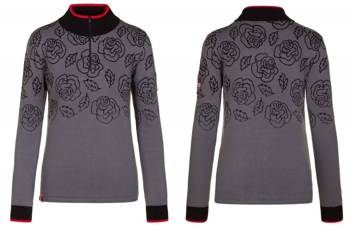 Das sehr feine, hochwertige Strickmaterial mit Rosenmuster fühlt sich wunderbar weich an. Der Stretchanteil sorgt zudem dafür, dass der Pullover auch nach häufigem Waschen top in Form bleibt.