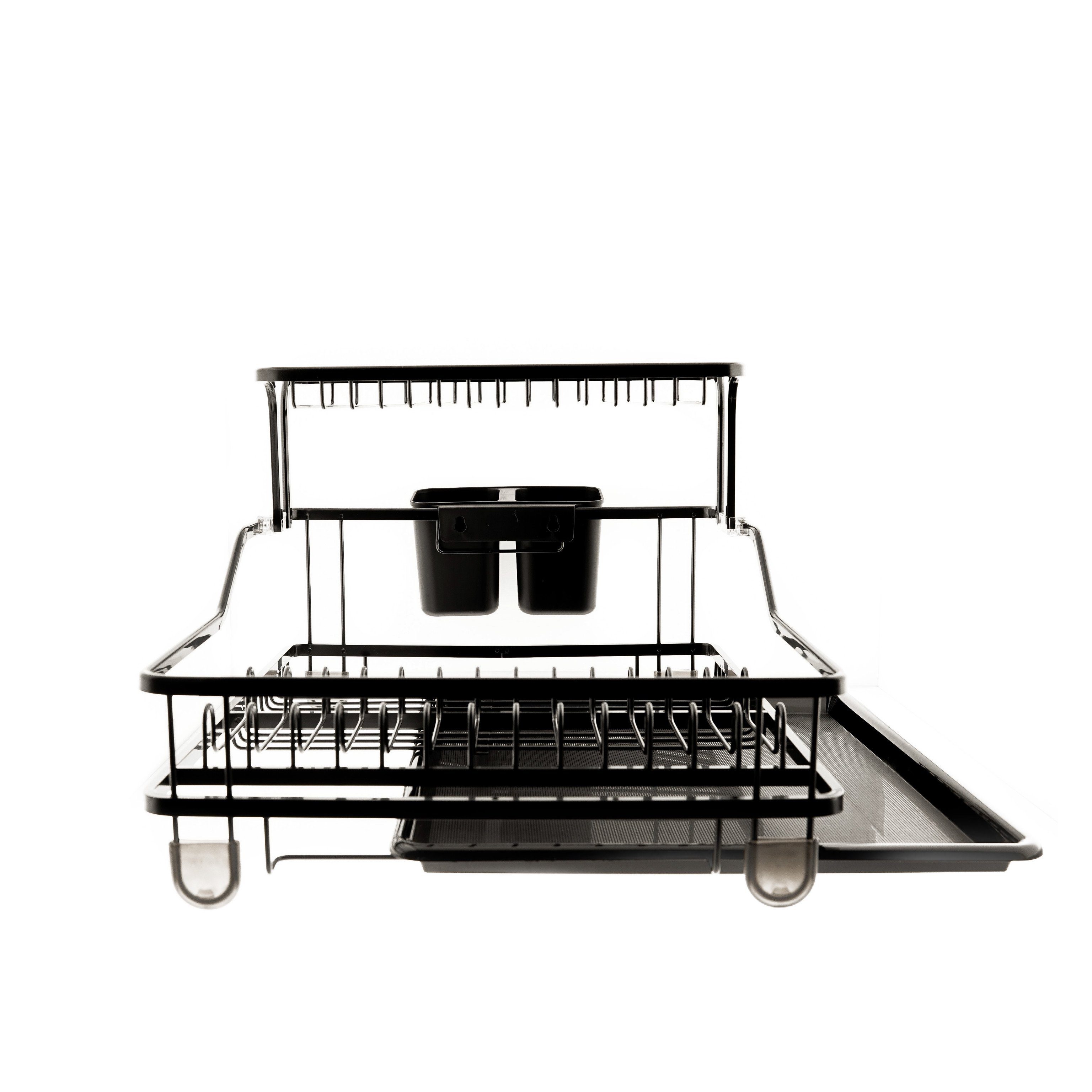 Dieses Abtropfgestell hat eine rechteckige Basis mit einem Gitter, die Ihr Geschirr sicher halten.