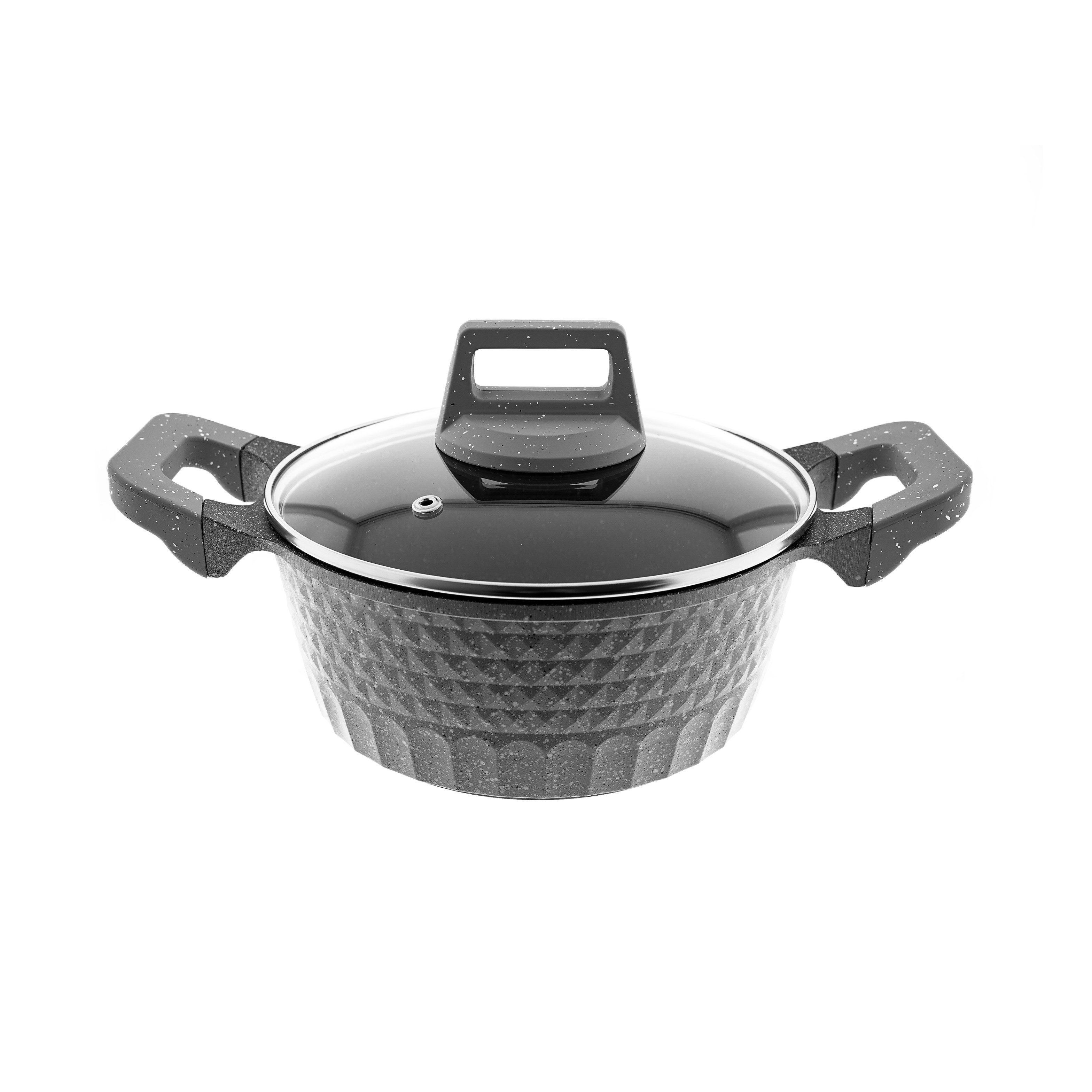 Die Antihaftbeschichtung sorgt dafür, dass Ihre Speisen nicht anhaften und erleichtert die Reinigung nach dem Kochen erheblich. Der mitgelieferte Glasdeckel ermöglicht es Ihnen, den Kochvorgang zu überwachen, ohne den Deckel abnehmen zu müssen, und hält gleichzeitig die Hitze und Feuchtigkeit im Inneren des Topfes.