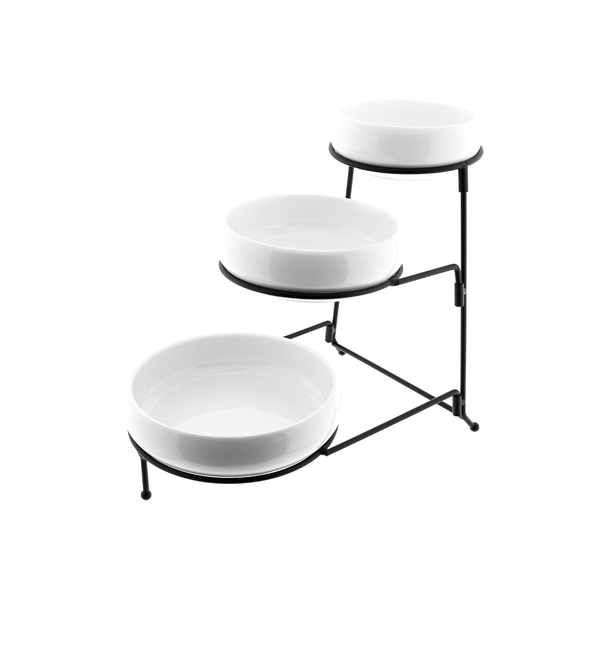 Ständer aus robustem schwarzem Material für Stabilität und Langlebigkeit. Schalen aus hochwertigem Porzellan in Weiß, die sowohl elegant als auch leicht zu reinigen sind.