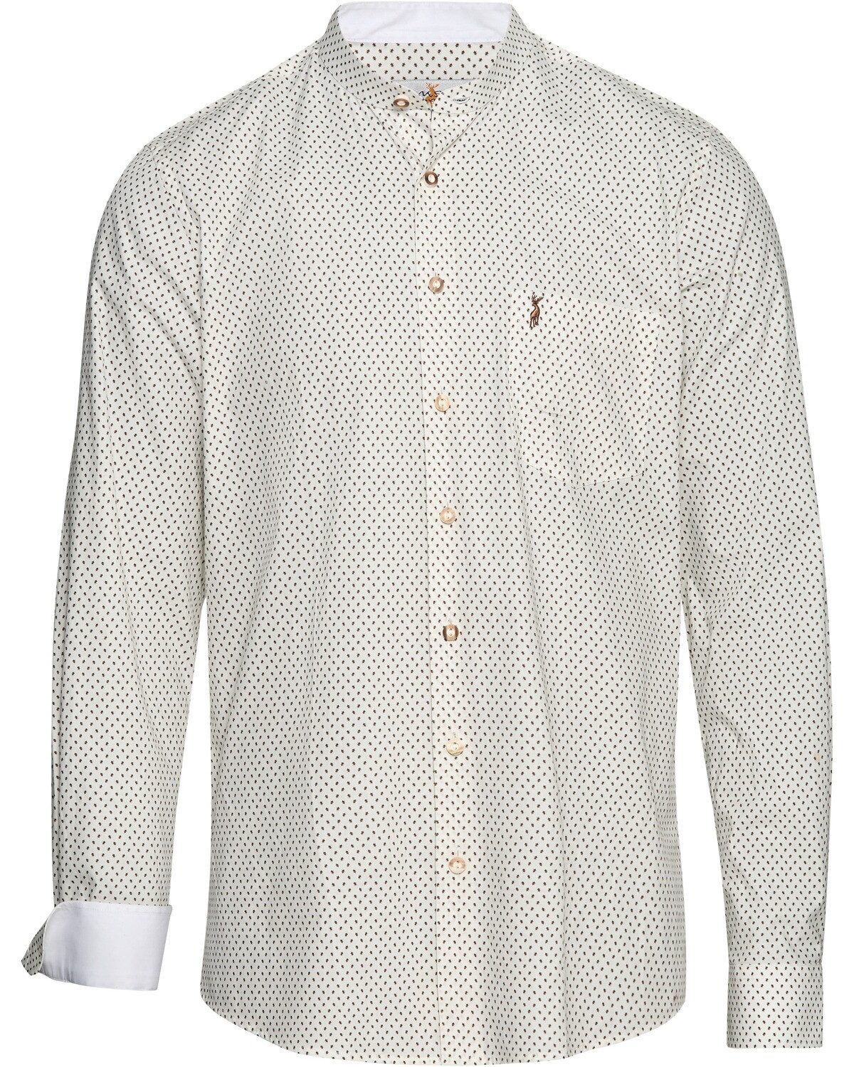 Das Herren Trachtenhemd von Almsach kombiniert klassische Trachtenelemente mit einer modernen und schlanken Passform. Gefertigt aus reiner Baumwolle, bietet das Hemd ein angenehmes Tragegefühl und überzeugt durch seinen Allover-Print mit feinen braunen Eichenblättern auf hellem Grund. Der kurze Stehkragen verleiht dem Hemd eine dezente Eleganz und macht es vielseitig kombinierbar. Die aufgesetzte Brusttasche wird durch eine kleine Hirsch-Stickerei akzentuiert, während Knöpfe in Hirschhorn-Optik den traditionellen Charakter des Hemdes unterstreichen. Kontrastbesätze am Krageninnenband und an der Manschetteninnenseite setzen stilvolle Akzente. Die Slim Fit Passform und die langen Ärmel machen dieses Hemd ideal für Männer, die Wert auf eine moderne Silhouette legen, ohne auf den authentischen Trachtenstil zu verzichten. Perfekt für Volksfeste, gesellige Anlässe oder einfach als stilvolle Ergänzung zur Tracht. Oberstoff: 100% Baumwolle
