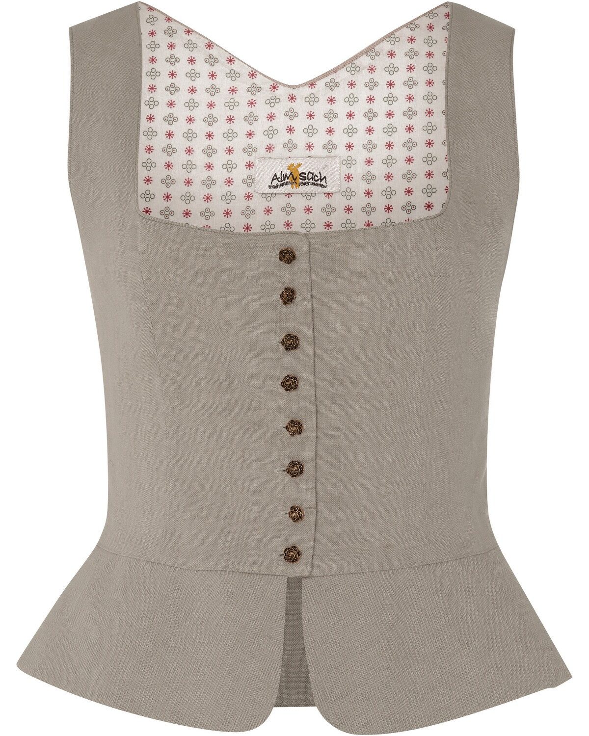 Das taillierte Damen Trachtenmieder von Almsach vereint traditionelles Design mit modernem Komfort. Hergestellt aus reinem Leinen, bietet es nicht nur eine angenehme Trageweise, sondern auch eine optimale Passform, die die feminine Silhouette gekonnt betont. Das Schößchen verleiht dem Mieder eine verspielte Note und macht es zu einem idealen Begleiter für festliche Anlässe oder gesellige Abende. Die durchgehende Knopfleiste in der vorderen Mitte sorgt für eine individuelle Anpassung und erleichtert das An- und Ausziehen. Jedes Detail wurde sorgfältig verarbeitet, um sowohl Funktionalität als auch Ästhetik zu gewährleisten. Das liebevoll bedruckte Baumwollfutter rundet das Gesamtbild ab und bietet zusätzlichen Komfort, indem es für ein angenehmes Hautgefühl sorgt. Dieses Trachtenmieder ist vielseitig kombinierbar und lässt sich sowohl zu klassischen als auch zu modernen Trachtenoutfits tragen. Ob bei festlichen Anlässen, auf dem Volksfest oder im Alltag – das Mieder von Almsach ist ein zeitloses Kleidungsstück, das Tradition und Stil harmonisch vereint. Oberstoff: 100% Leinen; Futter: 100% Baumwolle