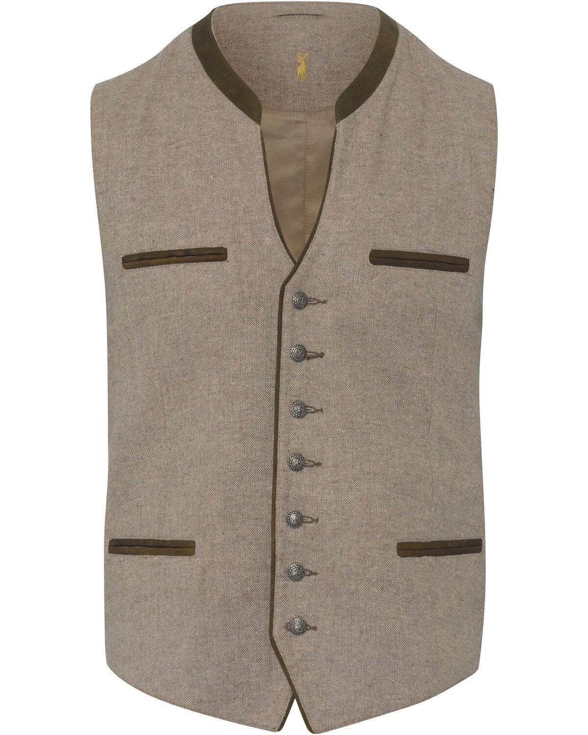 Die schmal geschnittene Herren Trachtenweste von Almsach vereint Tradition und modernen Stil auf elegante Weise. Das Vorderteil besteht aus Wollmix, der nicht nur für einen angenehmen Tragekomfort sorgt, sondern auch eine ansprechende Optik bietet. Der V-Ausschnitt und der Stehkragen verleihen der Weste eine stilvolle Silhouette, während die vier Paspeltaschen in Kontrastfarbe praktische Akzente setzen. Die sorgfältige Verarbeitung und die Liebe zum Detail machen diese Trachtenweste zu einem besonderen Kleidungsstück. Die Knopfleiste ermöglicht eine individuelle Anpassung und unterstreicht den klassischen Charakter der Weste. Der schwarze Futterrücken mit verstellbarem Riegel sorgt für zusätzlichen Komfort und eine optimale Passform, sodass die Weste sowohl bei festlichen Anlässen als auch im Alltag getragen werden kann. Ideal kombinierbar mit traditionellen Hemden und Hosen, ist die Almsach Trachtenweste eine hervorragende Wahl für stilbewusste Herren, die Wert auf Qualität und Design legen. Ob beim Oktoberfest, auf Familienfeiern oder in der Freizeit – diese Weste verleiht jedem Outfit einen Hauch von bayerischem Flair und zeitloser Eleganz. Oberstoff: 70% Wolle, 30% Polyester; Futter: 100% Polyester; Sonstige Materialien: 100% Baumwolle (Rücken). Dieser Artikel enthält nichttextile Teile tierischen Ursprungs.