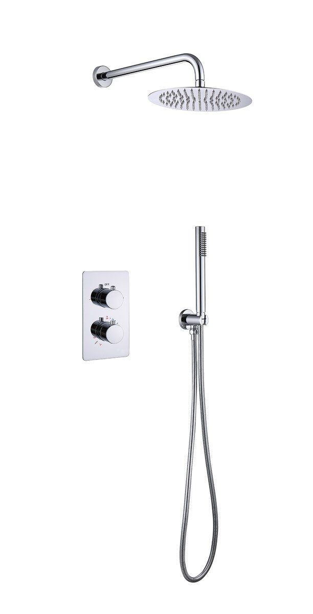 Sie wünschen sich für Ihren Duschbereich eine moderne Regendusche? Hier erhalten sie neben dieser auch eine Mischbatterie sowie eine Handbrause im passenden Set dazu! Die hochwertige Ausführung im modernen Stil zeichnet sich durch seine hohe Qualität und Beschaffenheit aus. Die flache Bauweise (6 mm) der Regendusche (Ø25cm) weiß zu überzeugen und ergibt in Kombination mit der Handbrause und der Mischbatterie eine zeitgemäße und innovative Erscheinung. Sowohl die Handbrause als auch die Regendusche verfügen über Anti-Kalk-Düsen, über die man einfach mit einem weichen Tuch wischen und somit der Kalkbildung vorbeugen kann. An der Mischbatterie kann man die Temperatur und die Funktion zwischen Regendusche und Handbrause verstellen. Achtung: Bei der Regendusche handelt es sich um eine Unterputz-Installation!