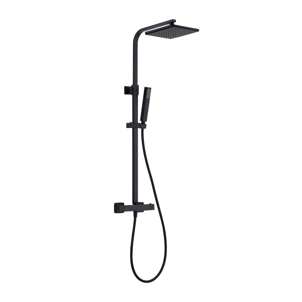 Erwerben Sie dieses Brausegarnitur, bestehend aus Regendusche, Handbrause, Duschstange und Thermostat für ihre Dusche. Sie bietet höchste Qualität mit schlichter doch moderner Optik und hochwertiger Verarbeitung. Die flache Bauweise (1,5cm) der Regendusche (20x20cm) weiß zu überzeugen und ergibt in Kombination mit der Handbrause und dem Thermostat eine zeitgemäße und innovative Erscheinung ab. Sowohl die Handbrause als auch die Regendusche verfügen über Anti-Kalk-Düsen, über die man einfach mit einem weichen Tuch wischen und somit der Kalkbildung vorbeugen kann. Dank der verstellbaren Duschstange (75-120cm) kann man bei der Bauhöhe sehr flexibel sein, einfach die gewünschte Höhe einstellen. Am Thermostat kann man die Temperatur und die Funktion zwischen Regendusche und Handbrause verstellen, wobei beide am Thermostat angeschlossen werden. Marke: Aloni Art: Brausegarnitur mit Kopfbrause, Thermostat und Handbrause Material: Edelstahl, Messing, Kunststoff Farbe: Schwarz matt Regendusche: 20x20cm Regendusche Breite: 1,5cm Handbrause Длина: 20cm Brauseschlauch Длина: 150cm Lieferumfang: Duschstange (mit Gleiter), Handbrause, Regendusche, Wandhalterung, Thermostat, Brauseschlauch