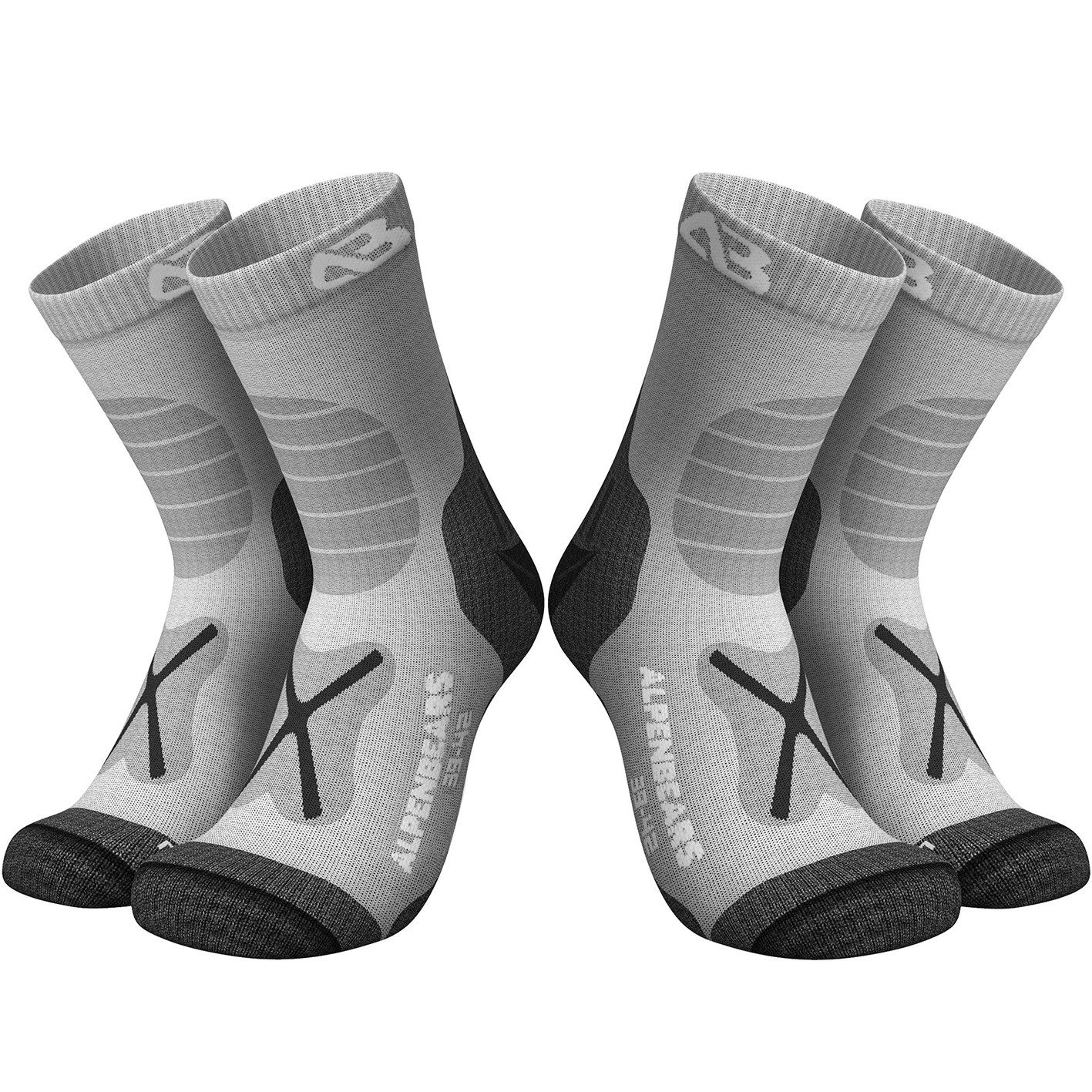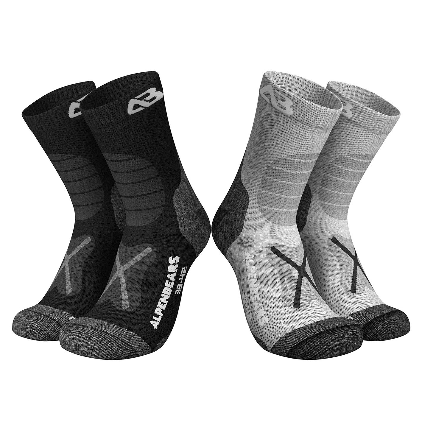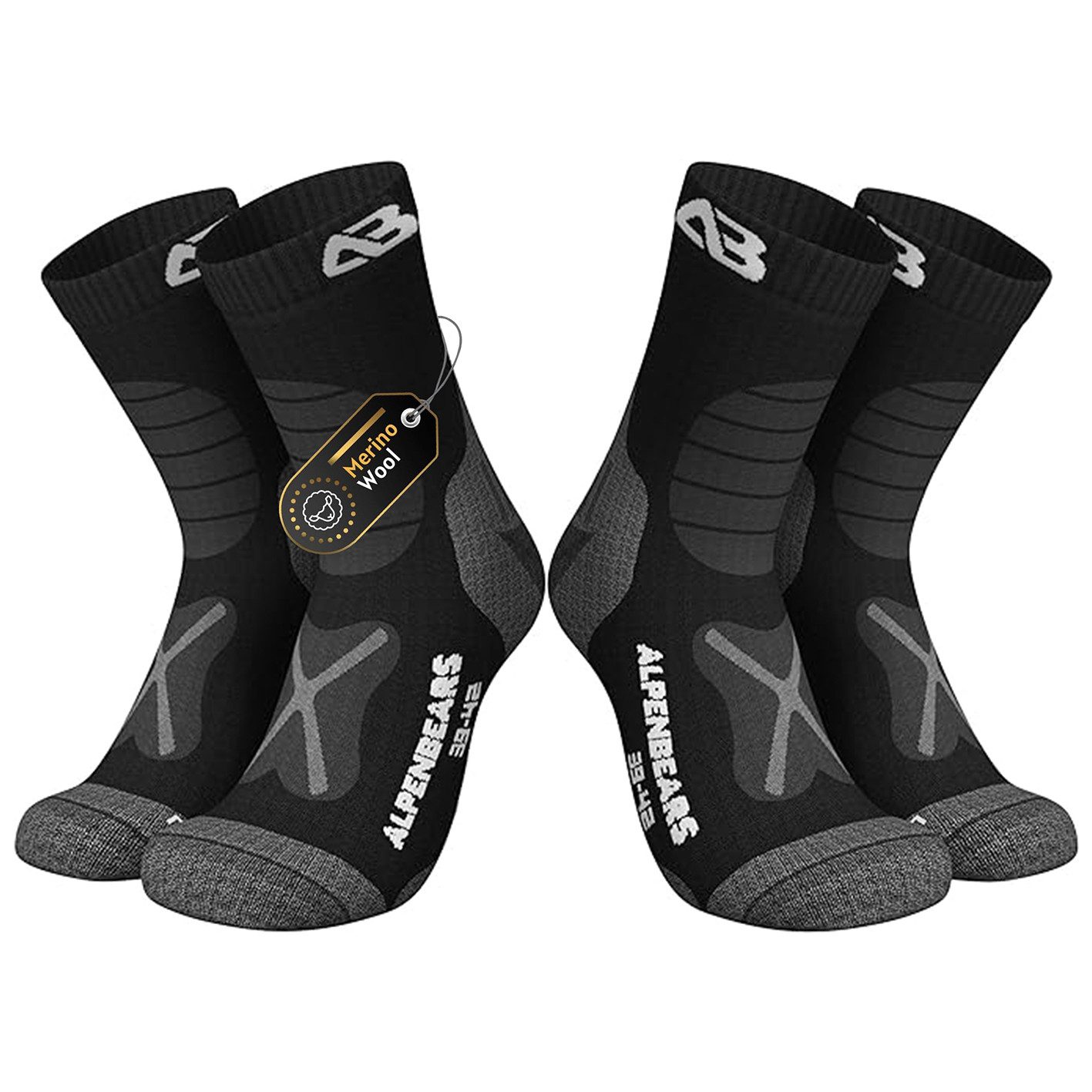 Unsere Alpen Bears Merino Socken bieten Ihnen höchste Premium-Qualität, die selbst höchsten Ansprüchen gerecht wird. Die Merino Socken gibt es in verschiedenen Größen von 31-48. Gefertigt aus hochwertiger Merinowolle, zeichnen sich diese Socken durch ihre hervorragenden isolierenden Eigenschaften aus und halten Ihre Füße selbst bei kaltem Wetter warm und trocken. Merinowolle ist zudem besonders weich und sorgt für einen unvergleichlichen Tragekomfort, der den ganzen Tag anhält. Dank der Anti-Blasen-Technologie mit einer enganliegenden Passform sitzen die Socken faltenfrei und beugen so der Bildung unangenehmer Blasen vor. Die enge Passform sorgt für optimalen Halt, ohne die Bewegungsfreiheit einzuschränken, sodass Sie sich auf Ihren Aktivitäten voll und ganz konzentrieren können. Die feuchtigkeitsregulierenden Eigenschaften der Socken machen sie zu einer hervorragenden Wahl für alle, die auf Komfort und Performance setzen. Die atmungsaktiven Materialien in Kombination mit einem effektiven Belüftungssystem gewährleisten eine ausgezeichnete Luftzirkulation. So bleibt Ihre Haut stets trocken, selbst bei intensiven Aktivitäten oder wechselnden Temperaturen. Die spezielle Polsterung der Socken schützt Ihre Füße zusätzlich und sorgt für ein angenehmes Tragegefühl. Das anatomisch geformte Fußbett passt sich perfekt an die natürliche Fußform an und bietet eine ideale Unterstützung für den Fußbogen und die Ferse. Dies reduziert den Druck auf Ihre Füße und fördert gleichzeitig eine gleichmäßige Verteilung des Gewichts. Ob beim Wandern, Trekking oder als gemütliche Alltags-Socken, diese Alpen Bears Merino Socken sind der ideale Begleiter für jede Gelegenheit. Sie bieten nicht nur optimalen Schutz und Komfort bei Outdoor-Aktivitäten, sondern sorgen auch zu Hause für kuschelig warme Füße. Setzen Sie auf die perfekte Kombination aus Funktionalität, Komfort und Stil!