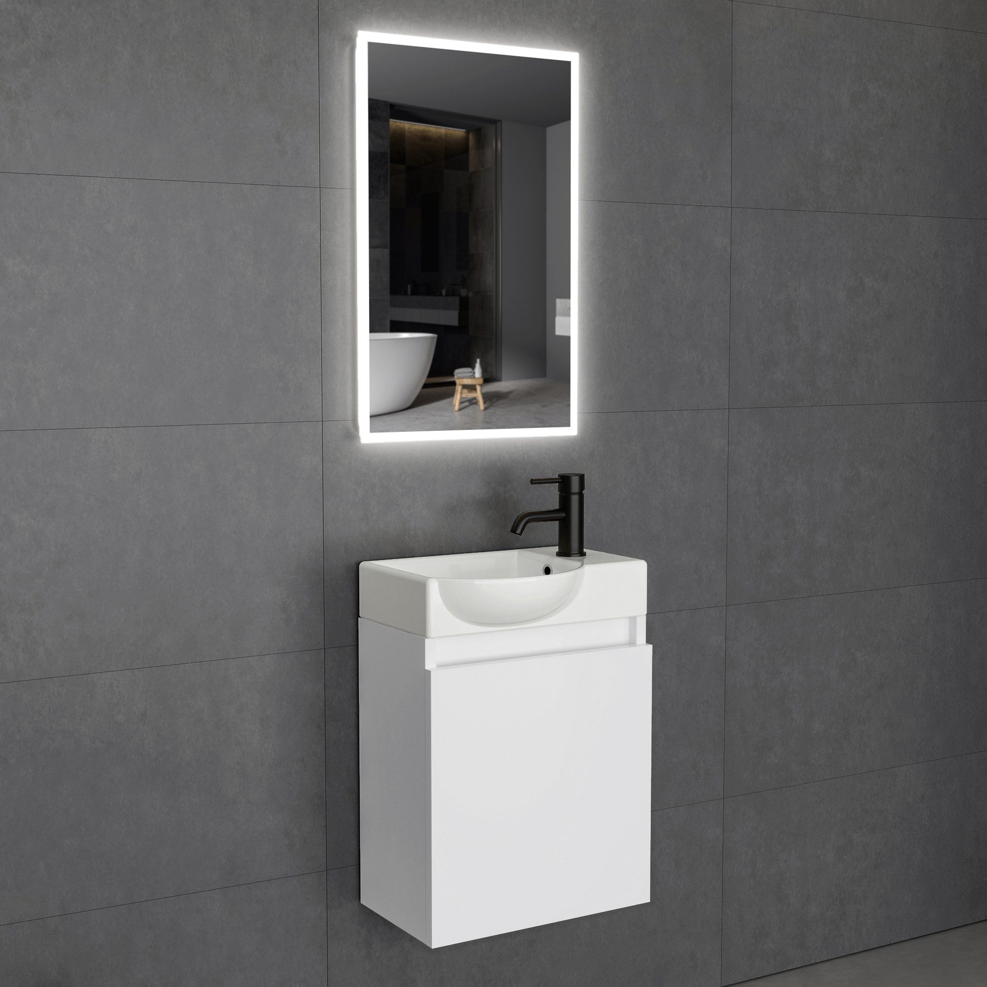Set beinhaltet | Keramik Handwaschbecken, Waschbeckenunterschrank, LED beleuchteter Spiegel |