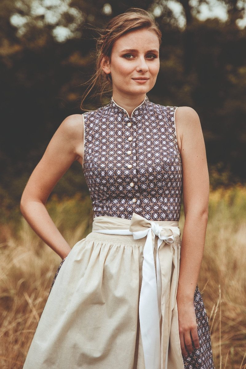 Dieses eindrucksvolle Retro Dirndl "Bruni" in Midi-Длина wird aus hochwertiger, gekämmter Baumwolle in angenehmer Stoffqualität gefertigt und hat allover ein fantastisches Printmuster mit raffiniert aus Tupfen gearbeiteten Kreisen und stilisierten Blüten in zwei Designs. Der stilvolle, leicht verstärkte Stehkragen und die Armausschnitte sind edel mit Schürzenstoff abgepaspelt. Die Knopfleiste vorn am sauber abgefütterten Mieder verfügt oben über einen kleinen Haken-Ösen-Verschluss und ist mit traumhaften, zart geriffelten Ösenknöpfen in Gold, geschmückt mit einem Einsatz im Perlen-Stil, besetzt. Der knieumspielende, in schicke Kellerfalten gelegte Rock verfügt beidseitig über Eingrifftaschen und vorn rechts über eine raffiniert an der Taillennaht angebrachte Tasche mit Knopf für bspw. das Smartphone. Komplett wird das atemberaubende, hochgeschlossene Midi Dirndl durch die herrliche, am Bund gehanselte Schürze aus feiner Baumwolle im unifarbenen Leinen-Look mit dem doppelten Schürzenbindeband aus weißem Satin und Schürzenstoff. Im Lieferumfang sind das Midi Dirndl und die Dirndlschürze enthalten, eine Dirndlbluse ist nicht inbegriffen.