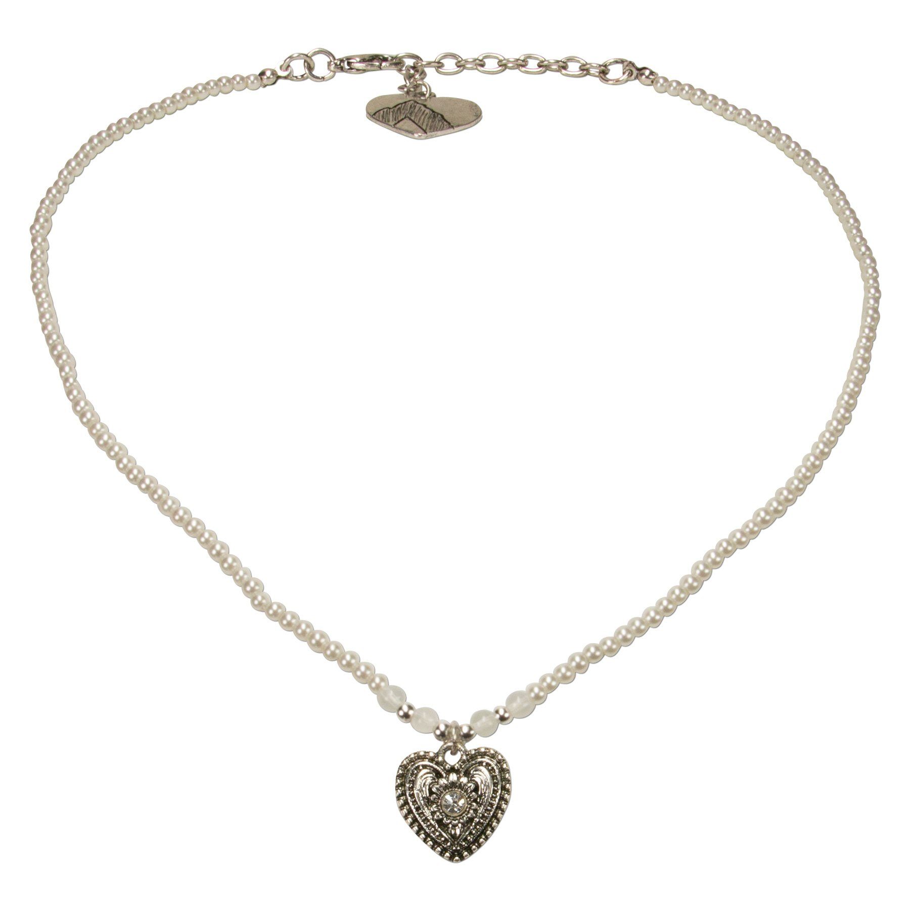 Filigran Perlen-Trachtenkette Trachtenherz: Dezente Trachtenkette bestehend aus vielen, kleinen Perlen, welche den eleganten Look der Kette unterstreichen. Der kleine antiksilber-farbene Trachtenherz-Anhänger passt ideal zu dieser wunderschönen Dirndlkette.