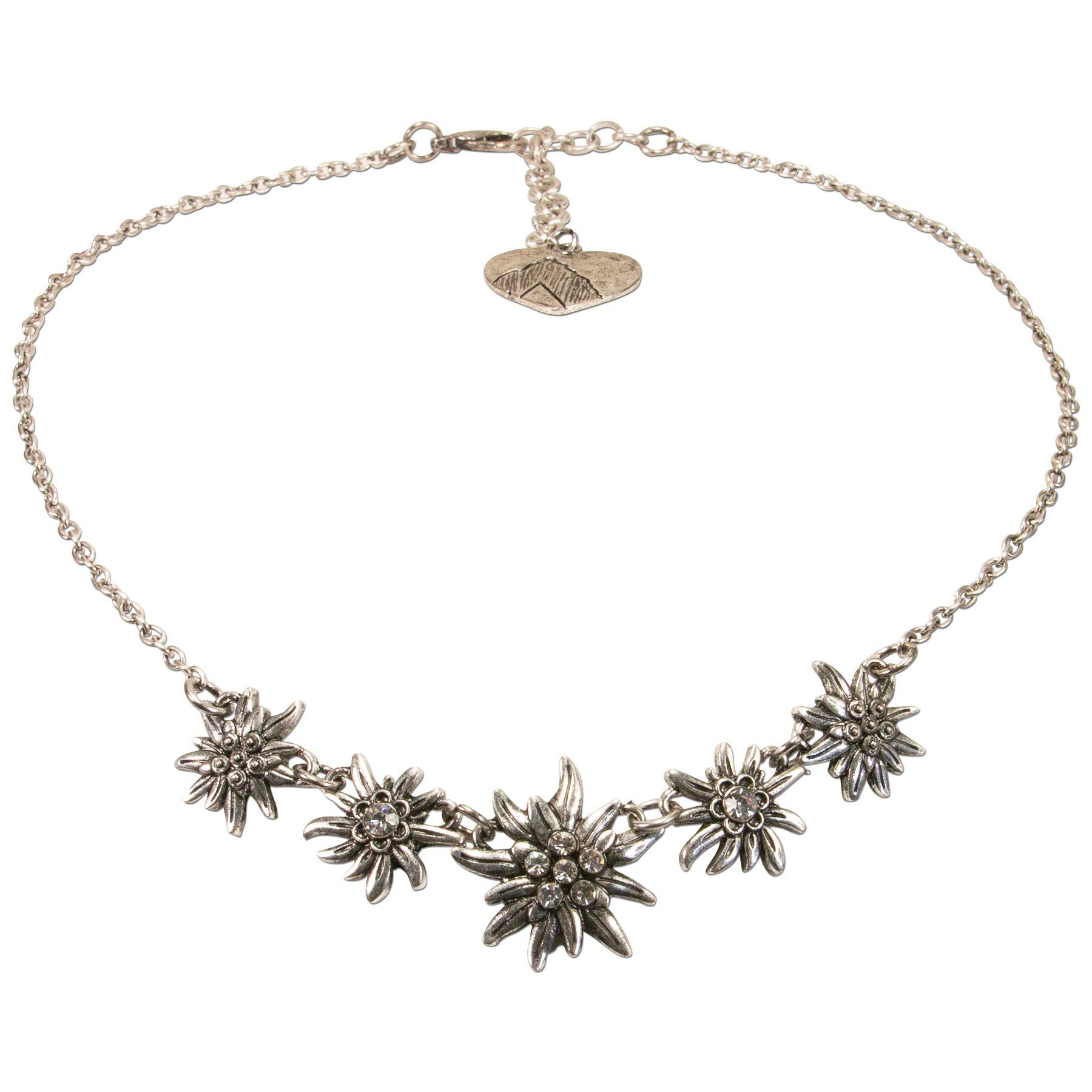 Trachten-Halskette Edelweiß- Symphonie: Die Halskette Edelweiß Symphonie besticht durch ihre fünf Edelweisse. Teils mit Strass-Steinen verziert funkelt die Trachtenkette und kann zu jedem Dirndl kombiniert werden. Ein absolutes Must-Have für alle Dirndl-Trägerinnen.