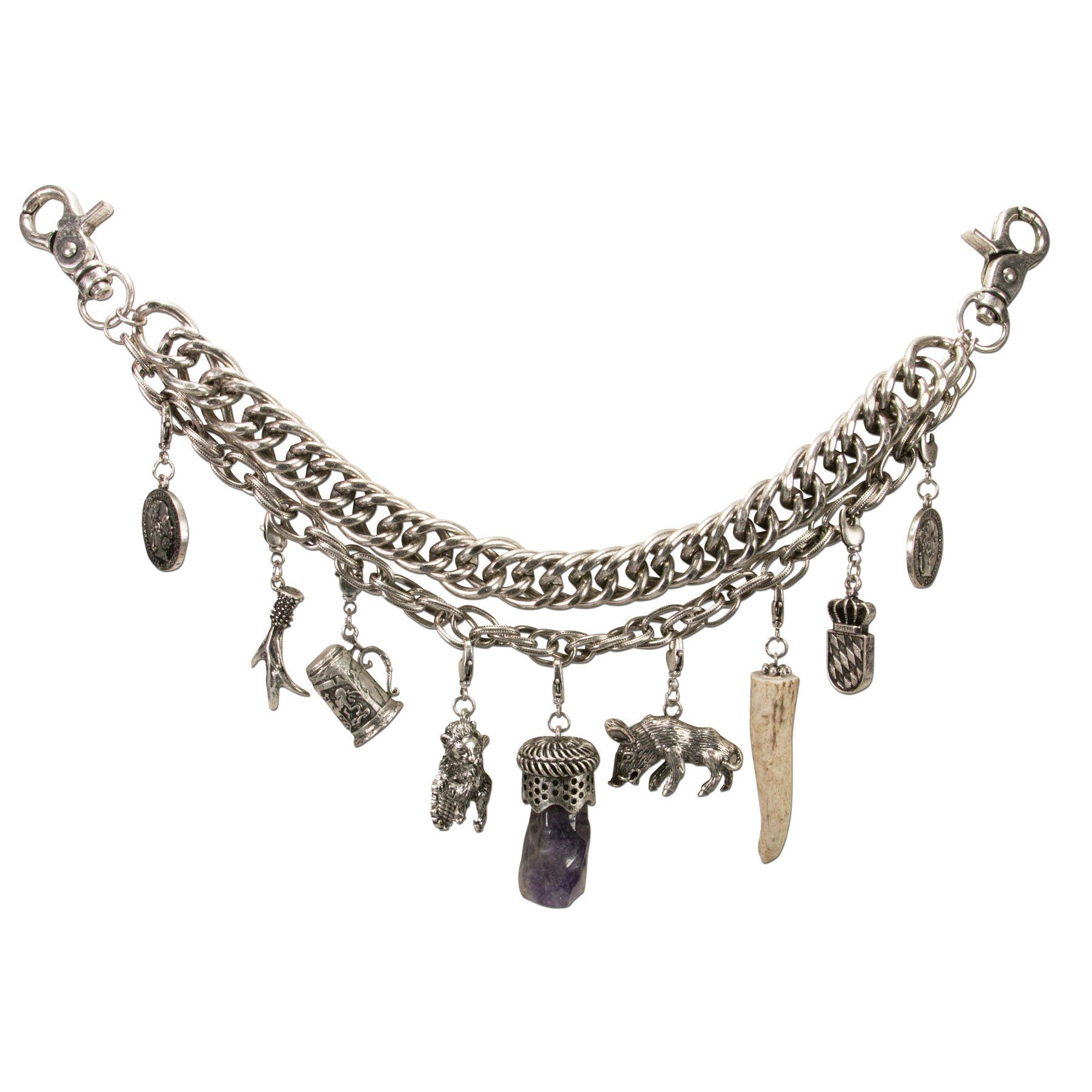 Длина Trachtencharivari mit Anhängern (echtes Horn-Rehspitz, Amethyst, Münzen, Wildschwein, Bierkrug, Löwe): ca. 34 cm