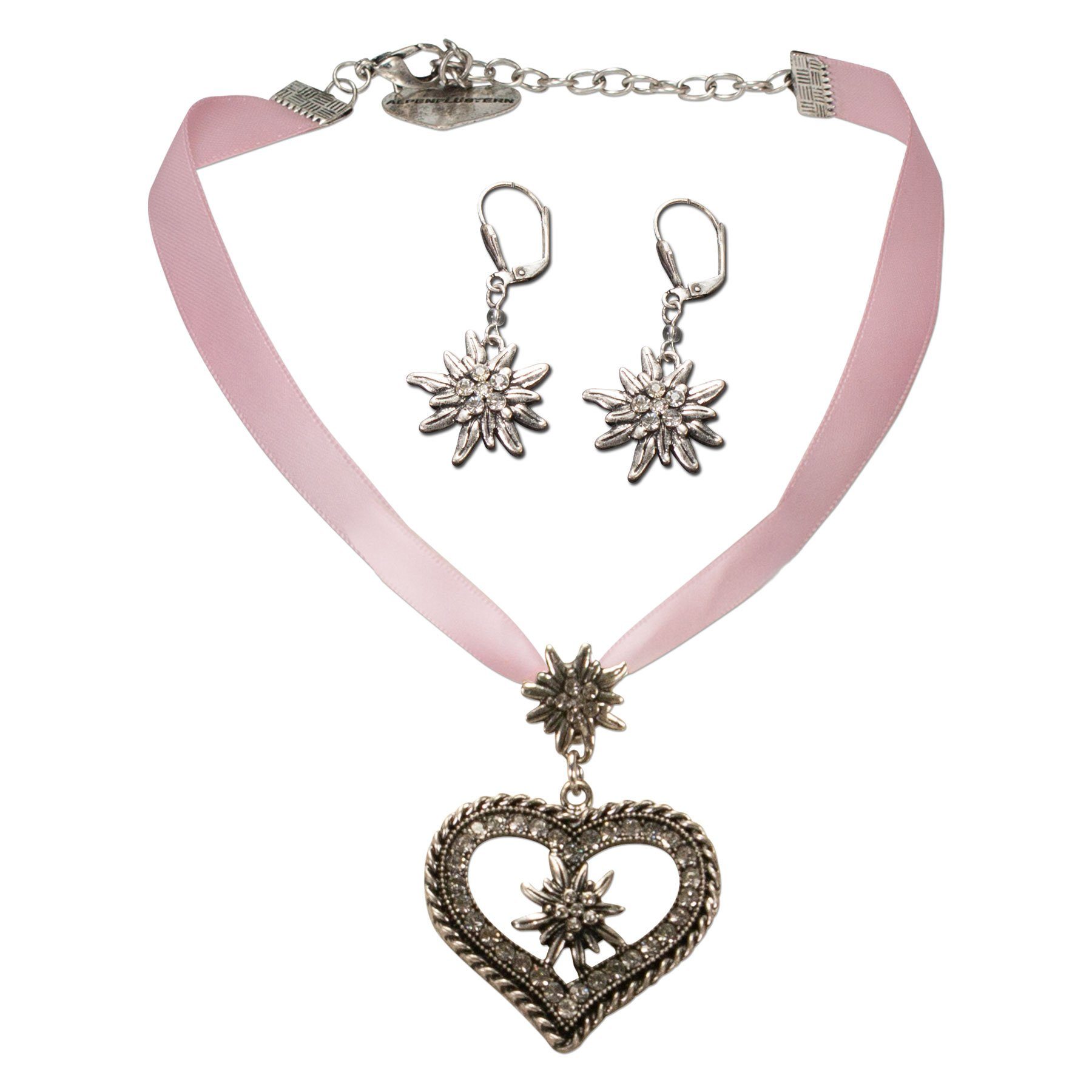 Trachtenschmuck-Set Satin-Trachtenkette Strassedelweissherz und Trachten-Ohrhänger Strass-Edelweiss: Schickes Trachtenschmuck Set zu Ihrem Dirndl. Die Satinbandkette hat ein Strass-Edelherz als Anhänger und passend dazu sind im Set Strass-Edelweiss-Ohrhänger enthalten. Mit diesem Schmuckset kann man nichts falsch machen, da es zu jedem Dirndl passt.