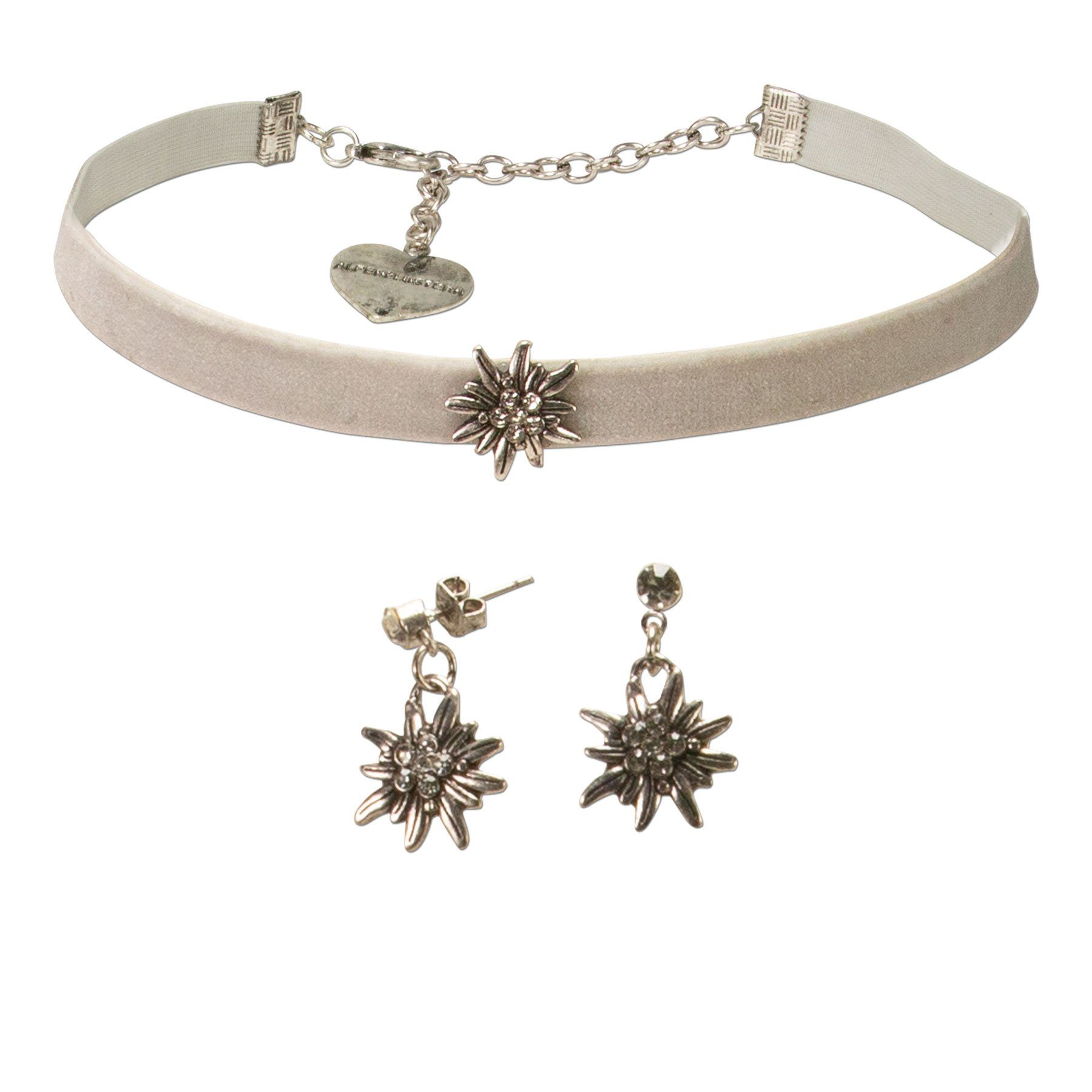 Alpenflüstern Ketten-Set Trachtenschmuck-Set Trachten-Samt-Kropfband und Ohrstecker Strass-Edelweiß mini (grau), - Damen-Trachten-Schmuck, Trachtenset Trachtenkette und Trachten-Ohrringe