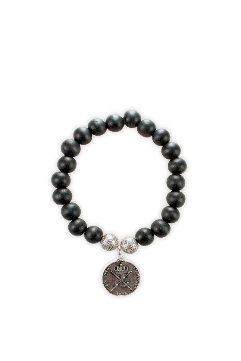 Das ideale Accessoire für Männer die auf markante Details setzen – dieses handgefertigte Perlenarmband besteht aus edlen Holzperlen, die auf einem elastischen Band für bequemen Tragekomfort aufgezogen sind. Highlight ist der silberfarbene Münzanhänger, eingerahmt von zwei filigranen Perlen. Die Münze zeigt vorn eine Krone mit gekreuzten Schwertern, hinten ein detailreiches Adlermotiv und hat einen Durchmesser von ca. 2 cm. Ein ausdrucksstarker Trachtenschmuck in hochwertiger Handarbeit.