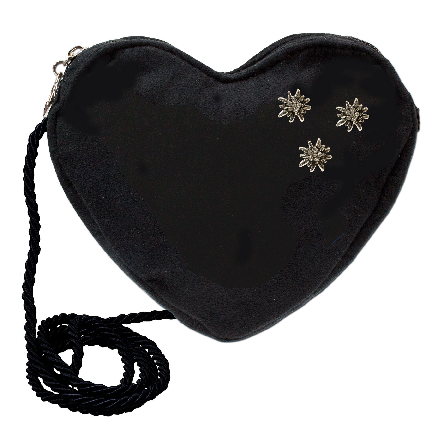 Herztasche Strass-Edelweiß Mini: Niedliche Herztasche mit drei kleinen Strass-Edelweißen verziert. Die Strass Edelweisse werden mittels Pins angebracht und können somit jederzeit abgenommen werden. Die Trachtentasche ist abgefüttert und wird durch ein Satinkordel-Schulterband getragen. Somit passt die Tasche ideal zum Dirndl.