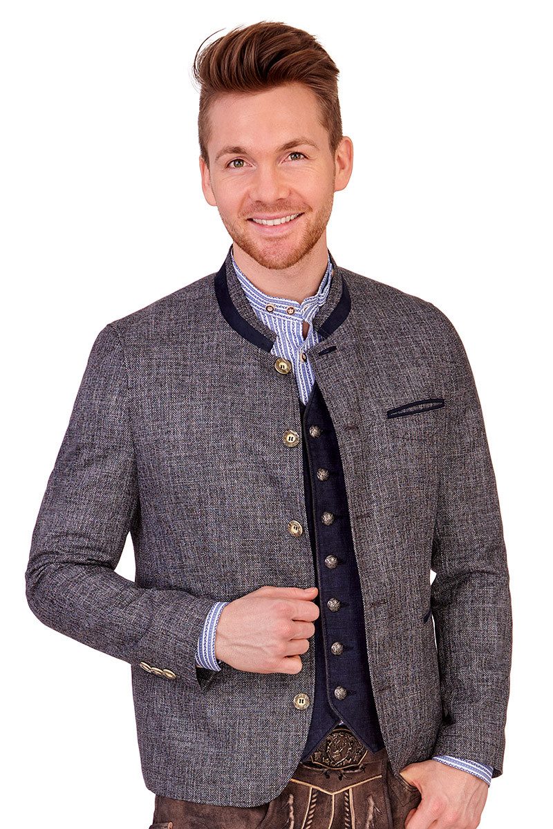 Dieser fantastische Herrenjanker namens Füssen ist ein uriges Schmankerl aus dem Hause Alpenwahnsinn, hat ein stilvoll-krachiges Webmuster im Melange-Look und eine mittelgrob gewebte, feine Stoffqualität. Den eleganten Stehkragen ziert auf der unteren Hälfte ein edler Velours-Besatz in Marine. Auch die Brusttasche links und die Eingrifftaschen sind mit doppelten, marine-farbenen Paspeln im Velours-Stil betont. Zudem haben die Seitentaschen eine Ziernaht als angedeutete Patte. Die Knopfleiste ist mit schmucken Knöpfen in Marmor-Optik bestückt, Knopf- und Knopflochleiste sind innen verstärkt. Je drei kernige Zierknöpfe dekorieren die Ärmelabschlüsse. Der Rücken der herrlichen Trachtenjacke ist beidseitig unten geschlitzt und die Ärmel sind ab den Ellenbögen dezent abgesetzt. Sowohl Brust- als auch Nackenbereich haben ein angenehmes Innenfutter im Karo-Stil, die Ärmel sind für einen super Tragekomfort ebenfalls gefüttert. Innen gibt es je eine Innentasche links und rechts mit Knopf und doppelter Paspel. Bitte beachten Sie die Größenzuschläge ab Размер 28 bzw. 56.